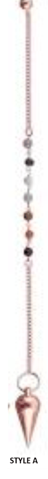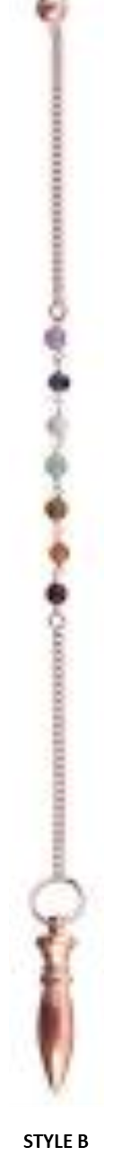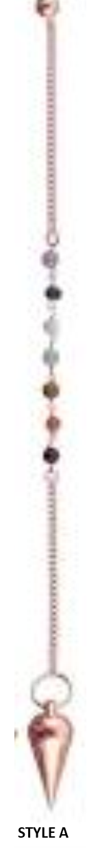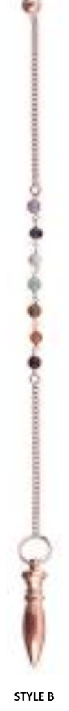 hese handsome pendulums are copper metal made in India, measuring 10" and come in two different styles. Each pendulum’s chain has seven chakra beads and a small copper sphere attached to the end for slip-free handling Pendulums are defined as objects attached at the end of a string or chain, when suspended from a stationary position, will swing back and forth or in a circular motion, based on the energy being connected with.