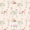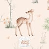 Create gentle and enchanting baby and nursery projects with this woodland seamless pattern, featuring a delicate baby deer surrounded by soft trees, a bunny, an owl and light butterflies.