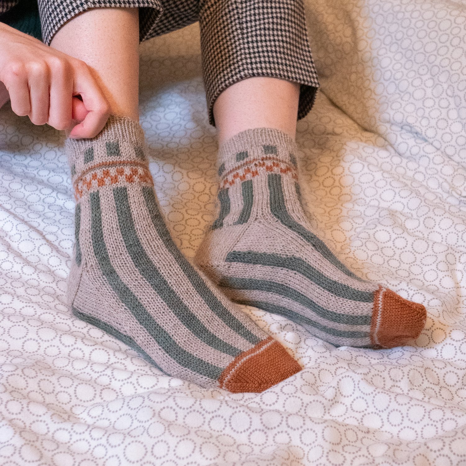 The Retro Diner socks are knit top down with an easy all over colorwork pattern. The gusset heel brings a lot of comfort to the sock.