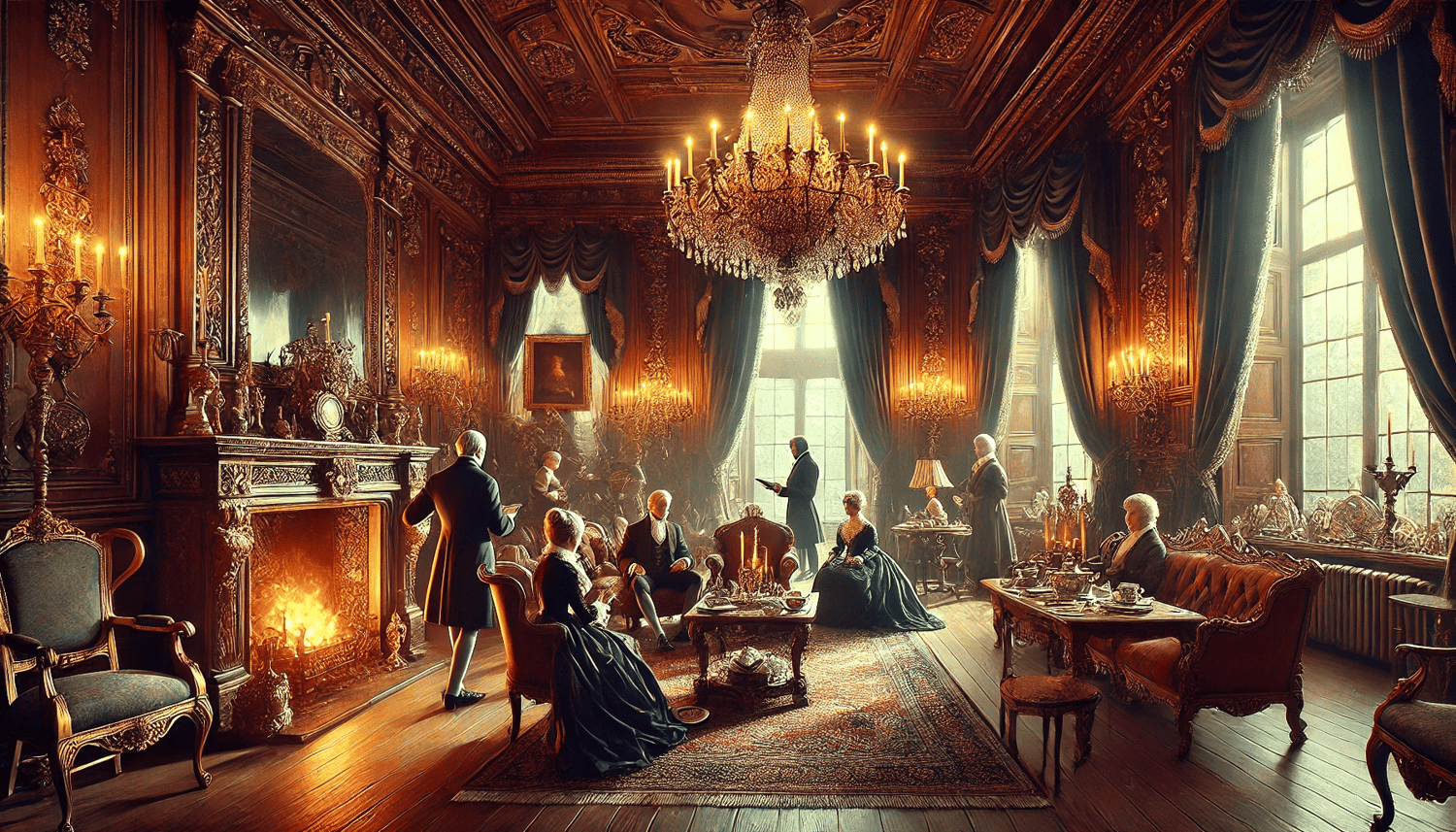 A lavishly detailed illustration capturing the grandeur of a Victorian-era drawing room, where aristocrats gather under the glow of candlelight and chandeliers. This artwork immerses viewers in the world of high society, evoking the sophistication and decadence of classic literature. Perfect for admirers of Great Expectations, The Picture of Dorian Gray, and 19th-century elegance.