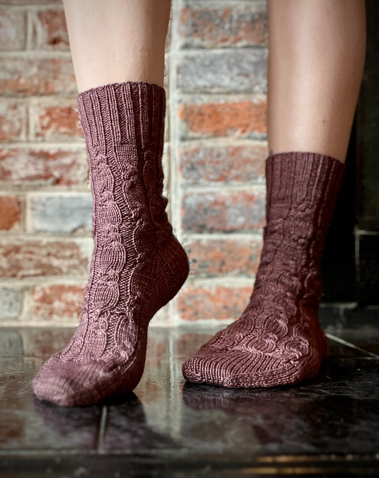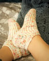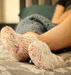 Sizes: toddler (children’s small, children’s large, adult XS, adult S, adult M, adult L, adult XL); finished foot circumference: 4 ½ (5 ½, 6 ¼, 7 ½, 8, 8 ½, 9, 9 ½)”/11.5 (14, 16, 19, 20.5, 21.5, 23, 24) cm
