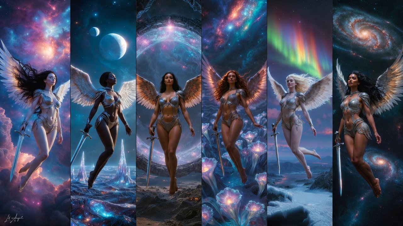 Cutting through ribbons of multicolored aurora above an icy alien tundra, she is the vigilant protector of frozen worlds. Platinum-blonde hair flows like liquid light, her fair skin luminous against the polar night. Serene and ever-watchful, her subtle smirk carries the confidence of one who commands the skies themselves, her colossal wings riding stellar winds, sword raised in eternal readiness.