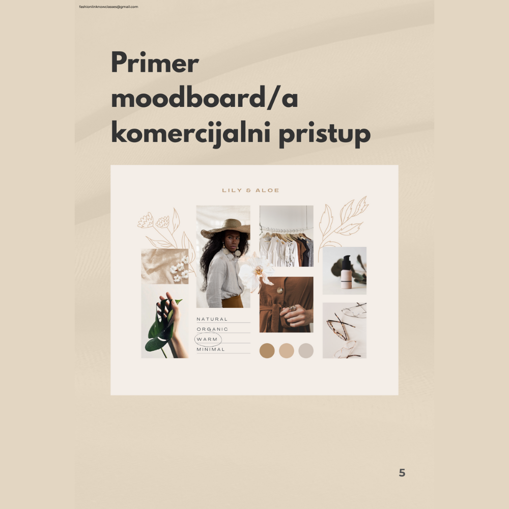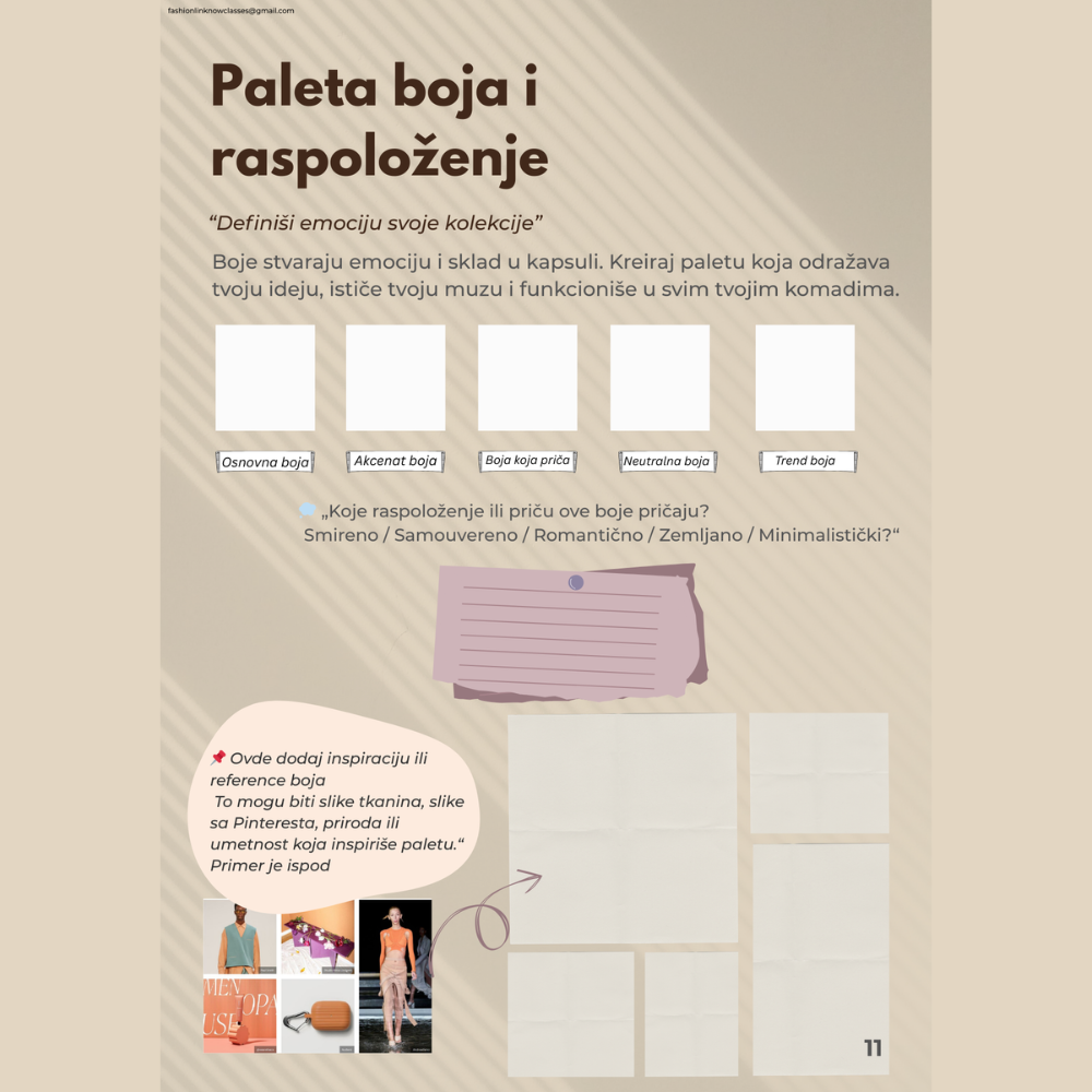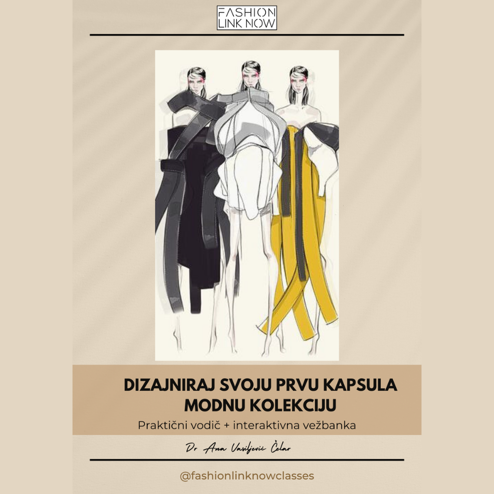 - Vežbanku sa praktičnim zadacima za definisanje inspiracije, palete boja, silueta i komada