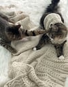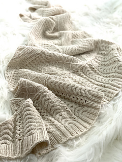This is an asymmetric triangle that is a large, mesmerizing wrap to knit. The three sections repeat throughout until the last part where you do some increases and work cables. There are video links for doing the cables without a cable needle and also a beginner’s alternative in case you don’t wish to cable at all.
