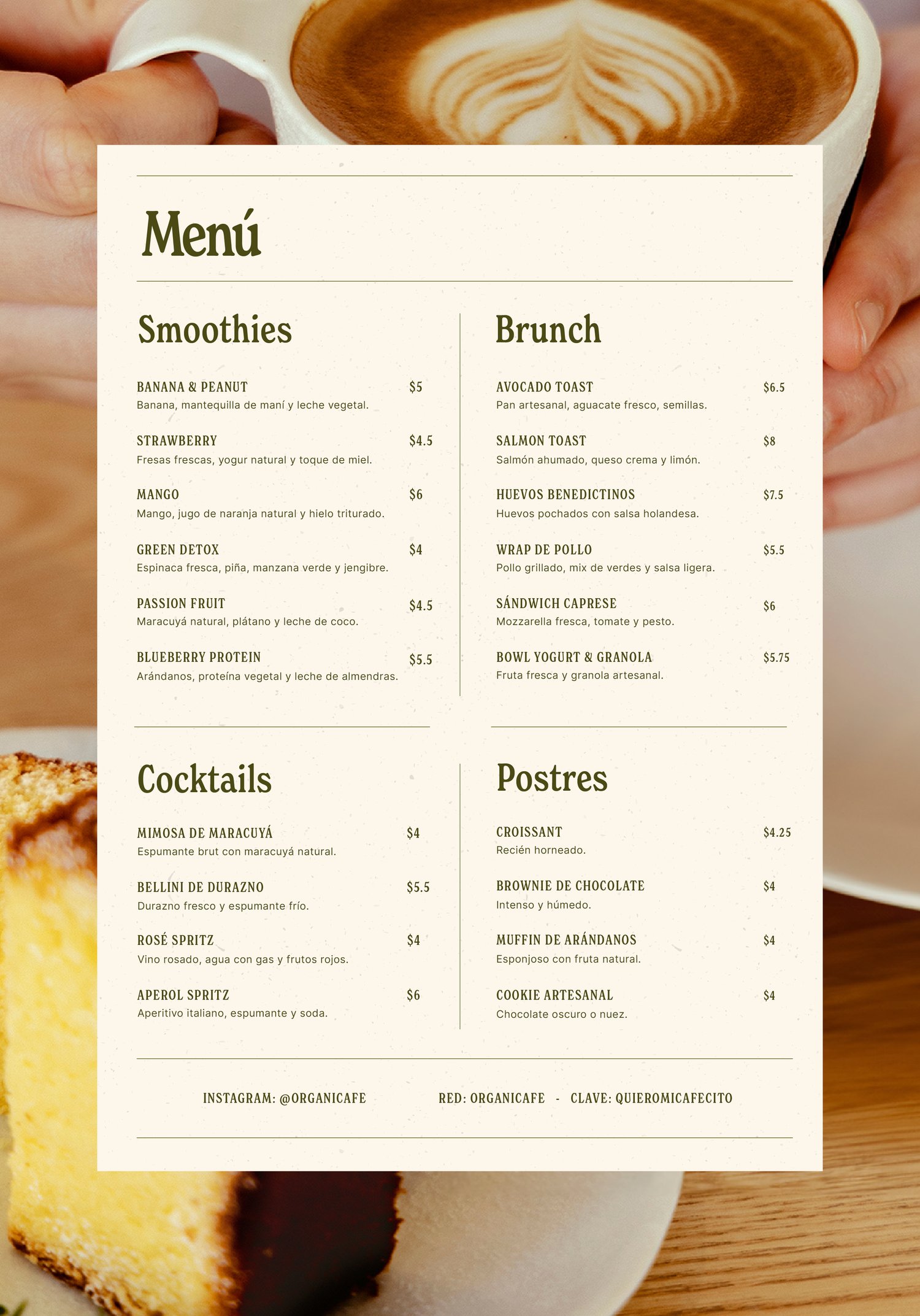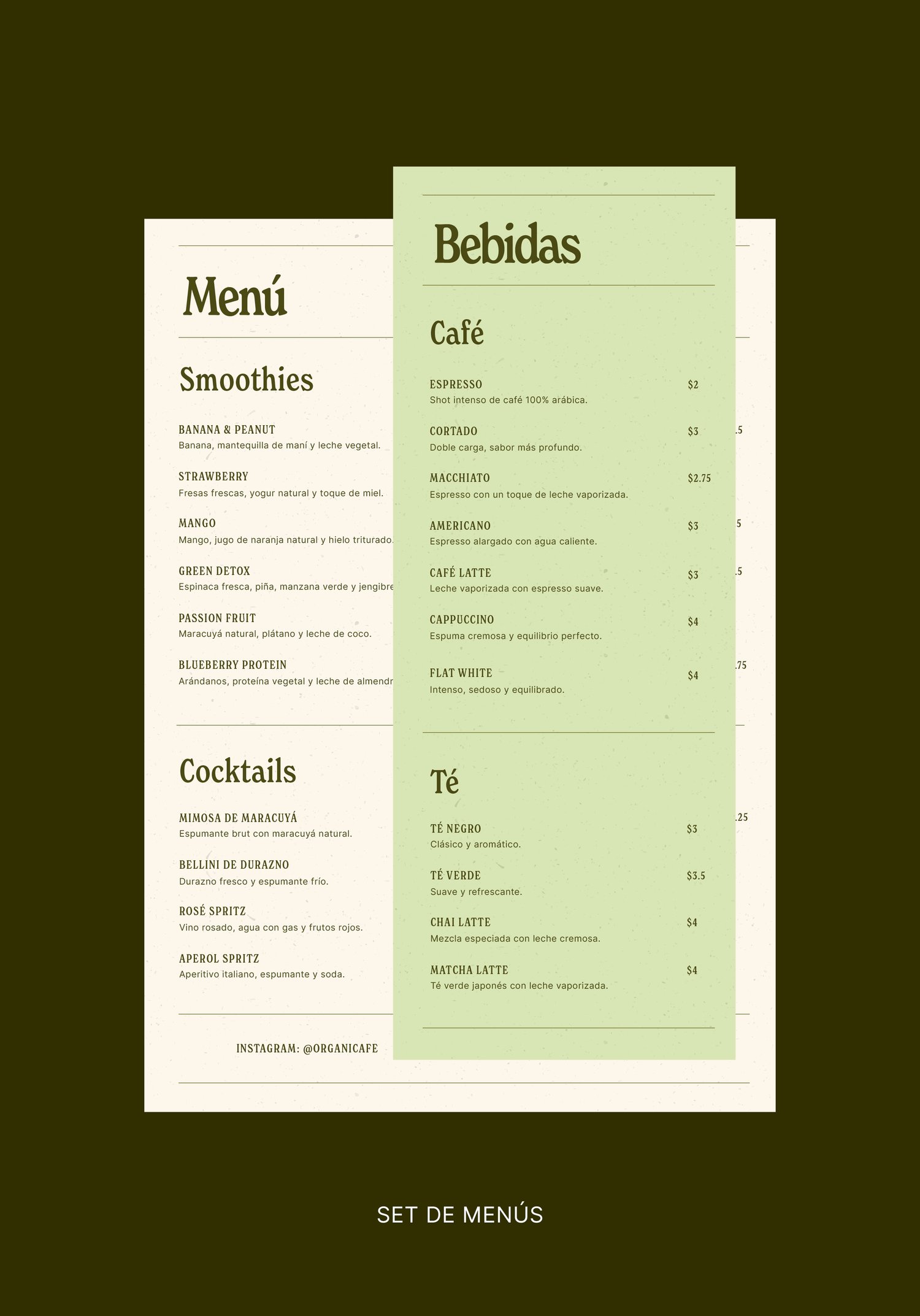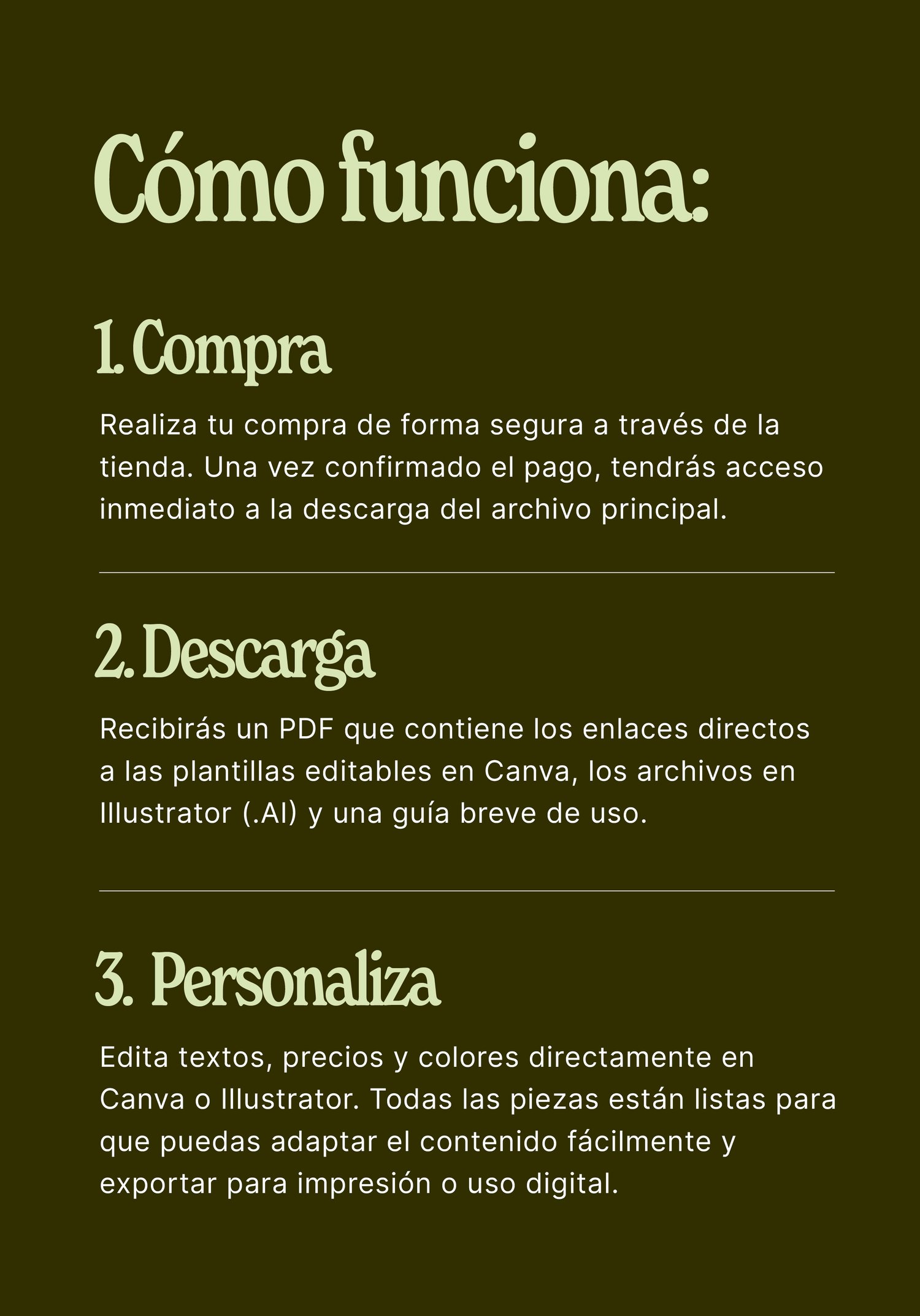 Este set incluye una colección de piezas diseñadas para presentar tu negocio de forma clara y profesional. Todas las plantillas están listas para personalizar con tu información, precios, logo y colores. Ideal para cafeterías, restaurantes pequeños o negocios gastronómicos que necesitan materiales impresos bien estructurados sin contratar diseño personalizado.