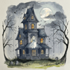 A spooky Halloween-themed watercolor painting created in Procreate. It shows a ghostly figure floating above an old haunted house under the full moon. The dark trees, bats, and misty night add an eerie and mysterious mood to the scene.