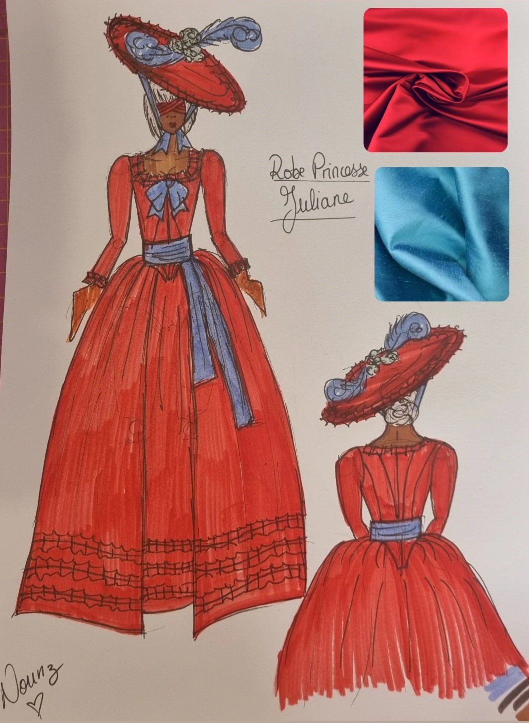 La Robe Princesse Juliane est une création unique inspirée du XVIIIe siècle, réalisée en satin duchesse rouge avec des finitions raffinées.
