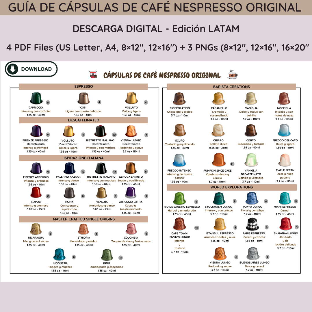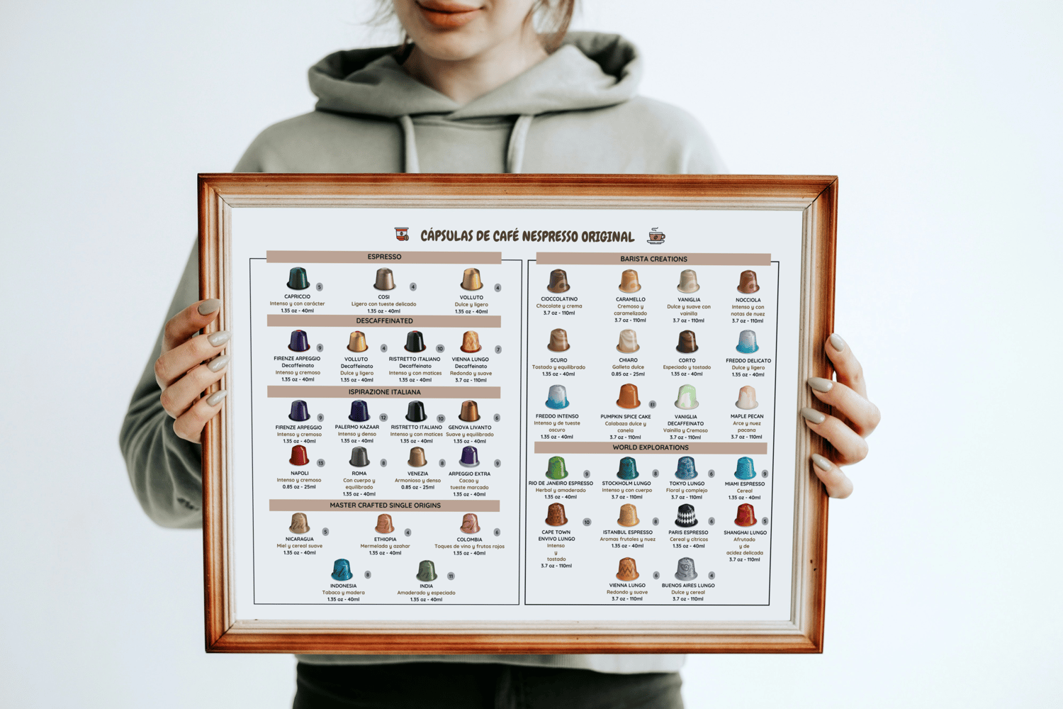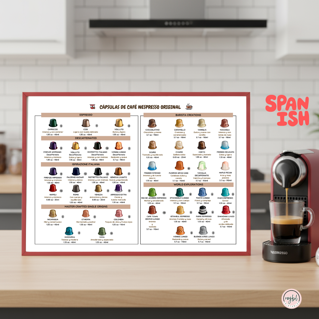 Guía Imprimible de Cápsulas de Café Nespresso Original en Español – Menú con Intensidad y Sabor, Decoración de Cocina, Descarga Digital