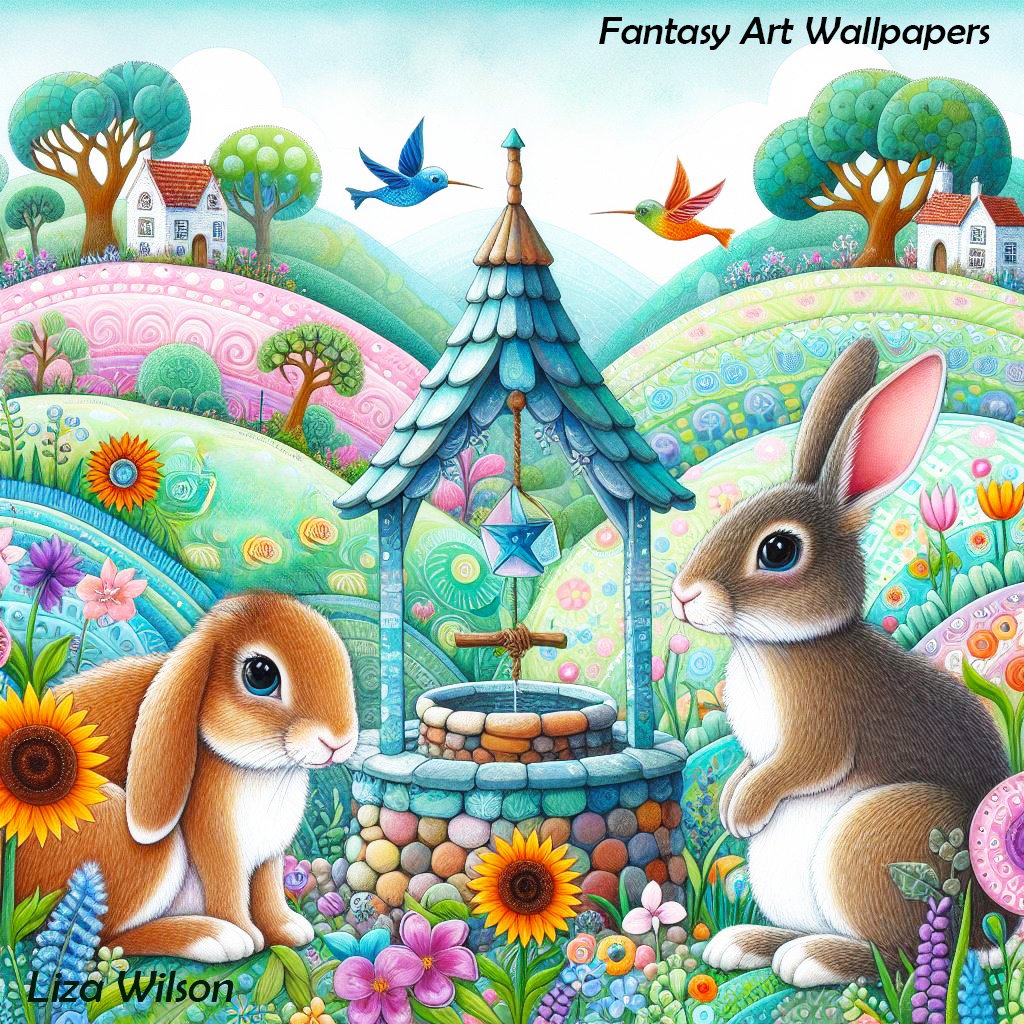 Cute rabbits on high patterned hills by a wishing well. There are flowers, trees & humming birds.