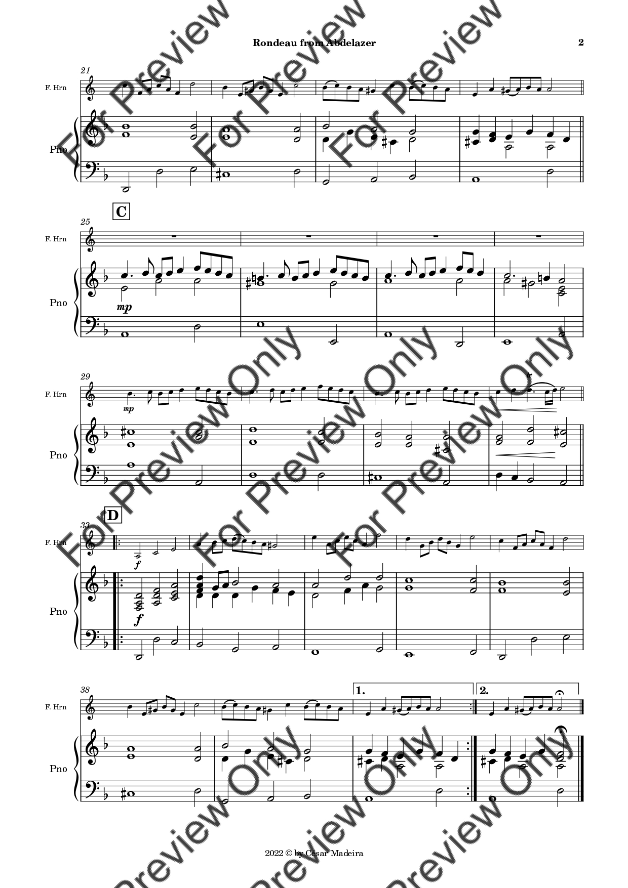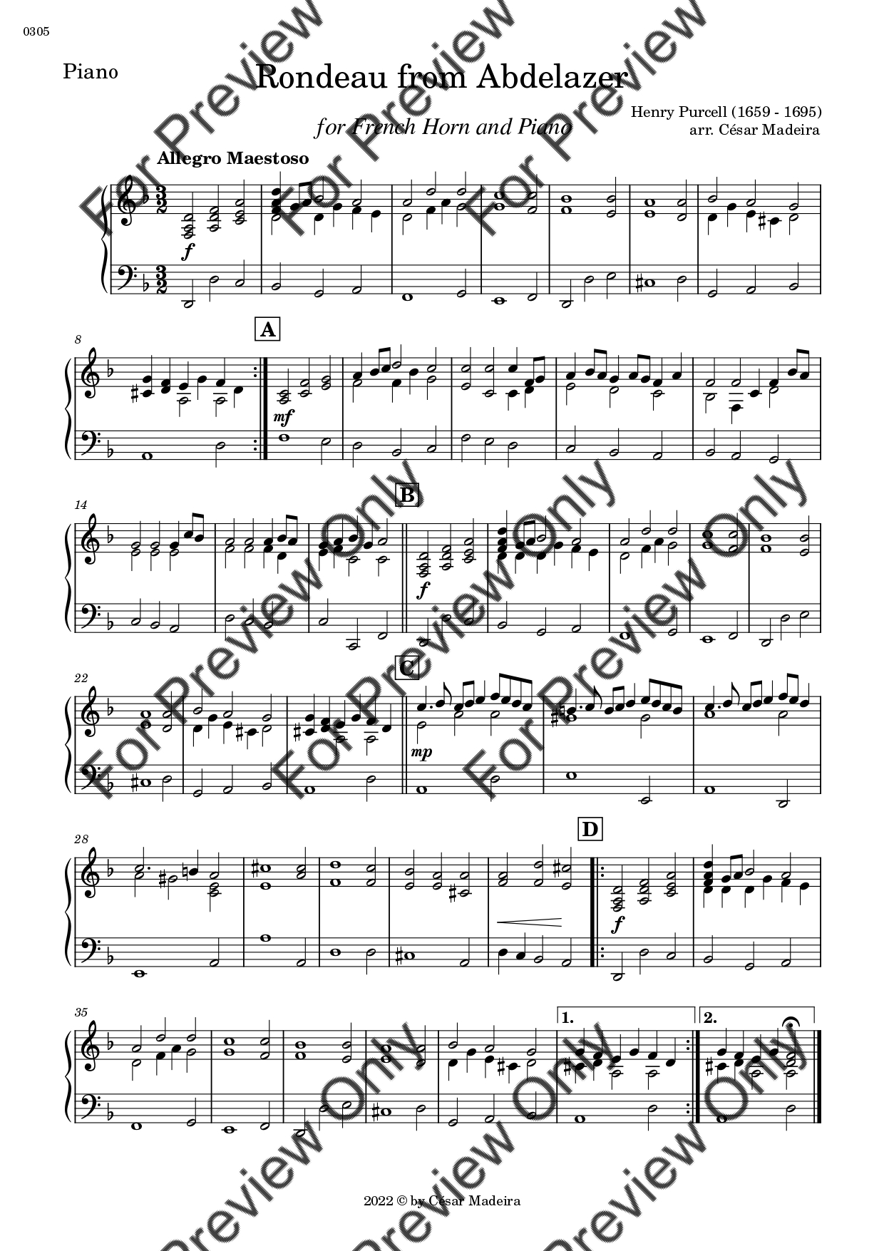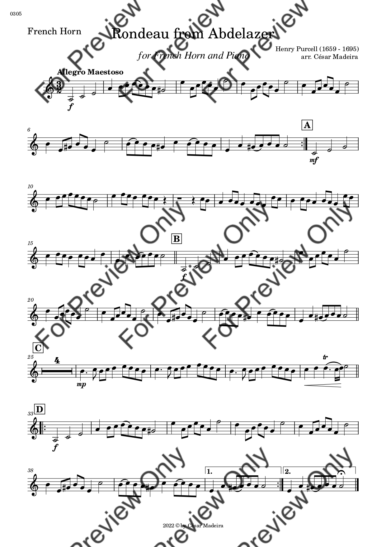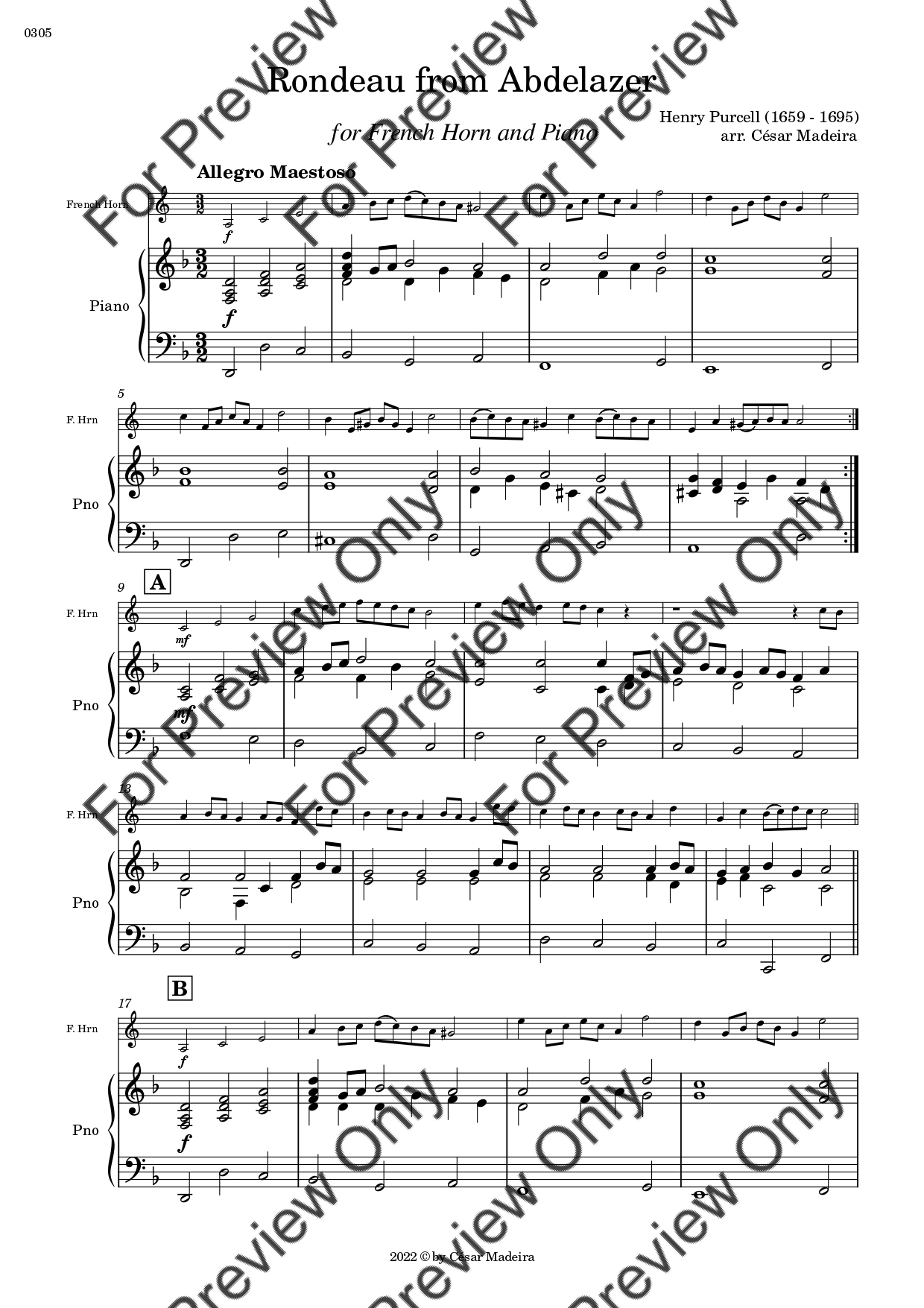 Rondeau from Abdelazer by Georg Friedrich Handel. Arrangement for French Horn and Piano. With Full Score and Individual Parts. Have fun!