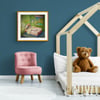 This printable wall art shows a young girl sleeping contentedly in bed with her pet dog on top of the sheets. An open book rests on the floor while a portrait of a curious cat is framed on the wall. A sign saying ‘Bless This Child’ hangs over the headboard as a rising moon discreetly illuminates the outside landscape.