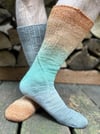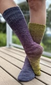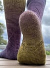 Polar Arc is the second in a series of love letters from me to gradient yarn (the first is Singularity, and there will be at least one more). It exploits the properties of fabric worked on the bias and reinforced heel stitch to create a heel without a heel turn. Unlike with other sock patterns, you don’t get a break in hue or pattern across the instep because he heel is completely integrated with the body of the sock. So It is is an excellent candidate for showcasing continuously dyed yarns such as gradient, self-striping or self-patterning.