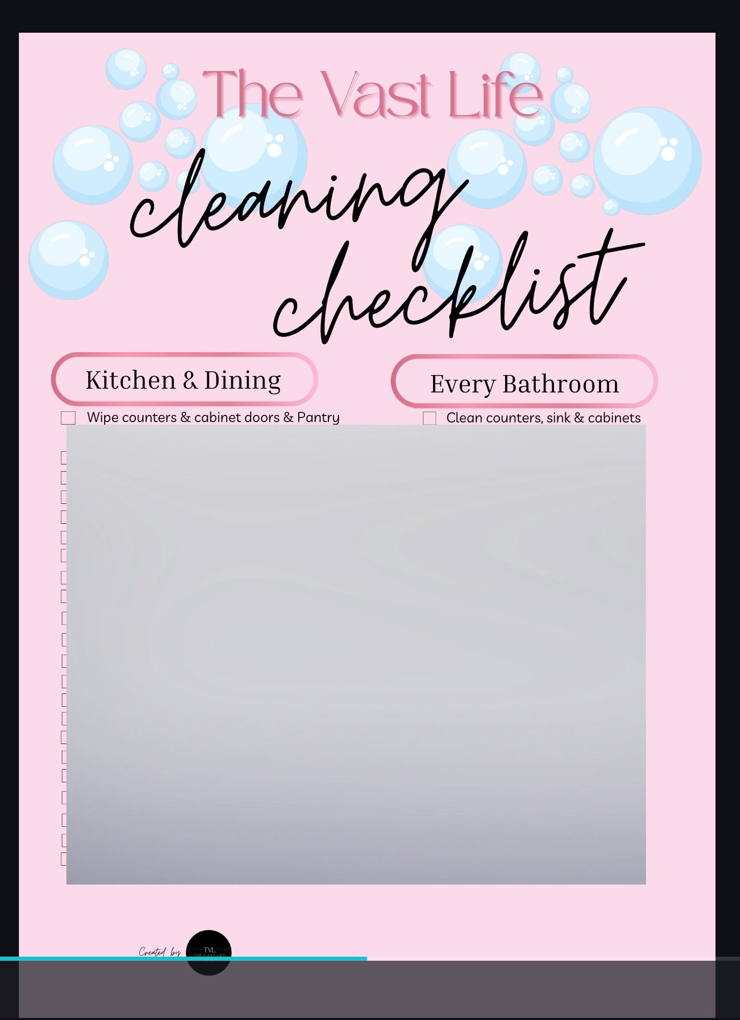 The Vast Life is Thrilled to share our USA Cleaning Checklist as well as tips and tricks we have learned over the years. Amy worked in Canva to create her checklist of a True Clean or as most would call it a DEEP CLEAN for your home. This one time purchase is your guide to how to get your home to that spotless shine.