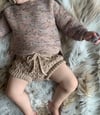 These bloomers are knit top down beginning with a provisional cast-on and starting at the drawstring channel. The body is worked in the round and then separated into front and back panels that are shaped and joined in the middle to create your leg-holes. The ribbing at the leg openings are worked in the round using picked up stitches.