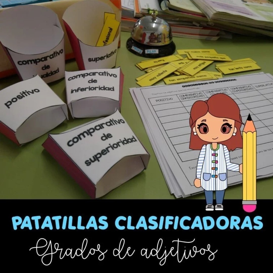 - 6 cajas para montar de patatillas de diferentes grados: positivo, comparativo de inferioridad, comparativo de igualdad, comparativo de superioridad, superlativo y una caja general de grados de adjetivos.