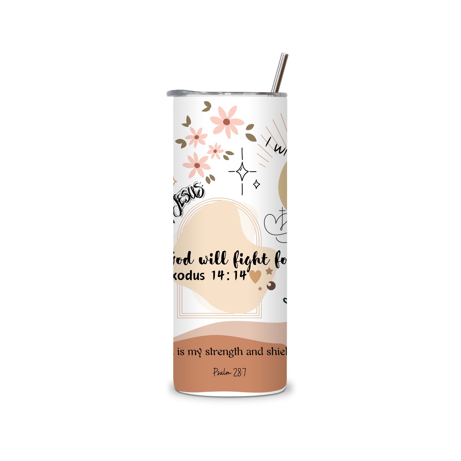 Bring peace, comfort, and inspiration into your day with this beautiful Neutral Christian 20 oz Skinny Tumbler. Designed with soft beige, blush, and earthy tones, this tumbler features encouraging Bible verses such as Philippians 4:13, Psalm 23:4, Exodus 14:14, and Psalm 28:7.