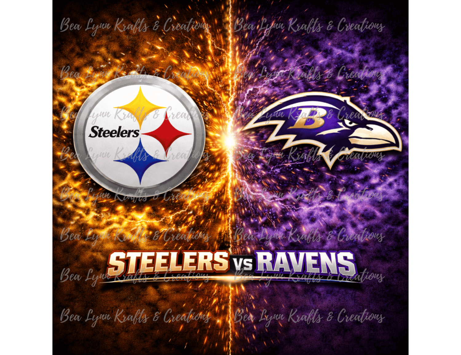 High-resolution Steelers vs Ravens matchup PNG featuring an intense split-lightning effect in gold and purple. Perfect transparent PNG for sublimation, shirts, tumblers, stickers, and game-day crafts. Ideal for rivalry merch and bold football fan creations.