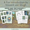 It also features two coloring pages, a word search, and a brief info sheet on Van Gogh, as well as printing ideas and links to further resources.