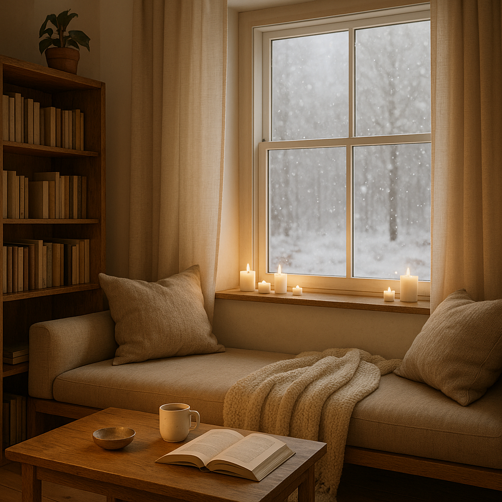 Create a calming, cozy vibe in your home with this high-resolution printable wall art of a serene Scandinavian reading nook. Designed to feel like a real photograph, this image features a soft bench layered in chunky throws and pillows, glowing candles on the windowsill, and a gentle snowfall outside the window.