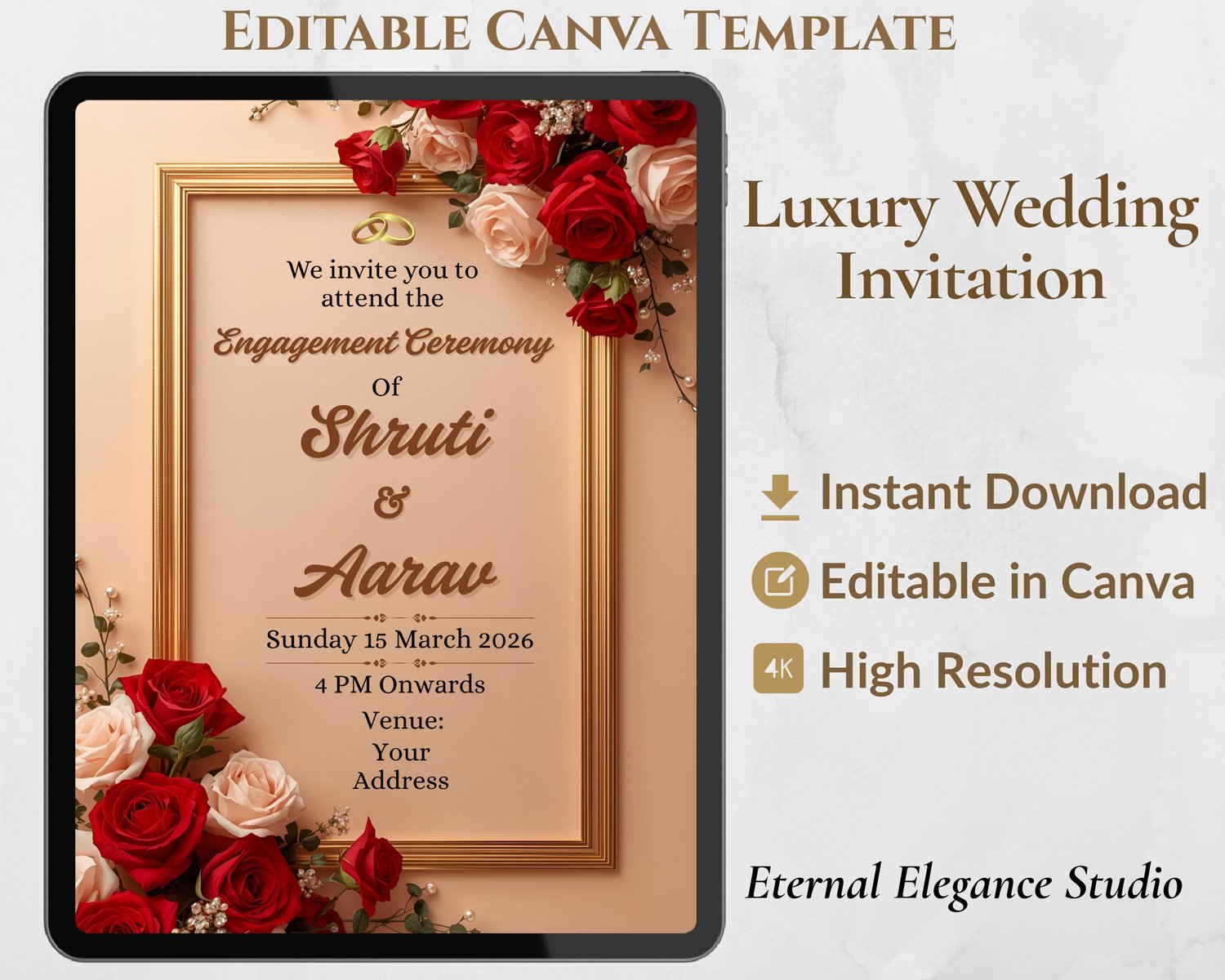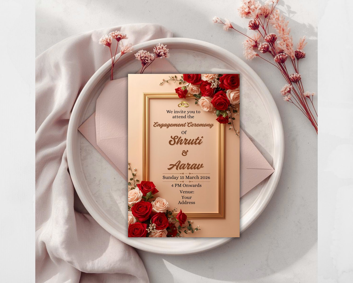 Designed with rich red roses, a classic gold frame, and a soft pastel background, this invitation gives a royal, classy, and timeless look—perfect for modern yet traditional engagement ceremonies.
