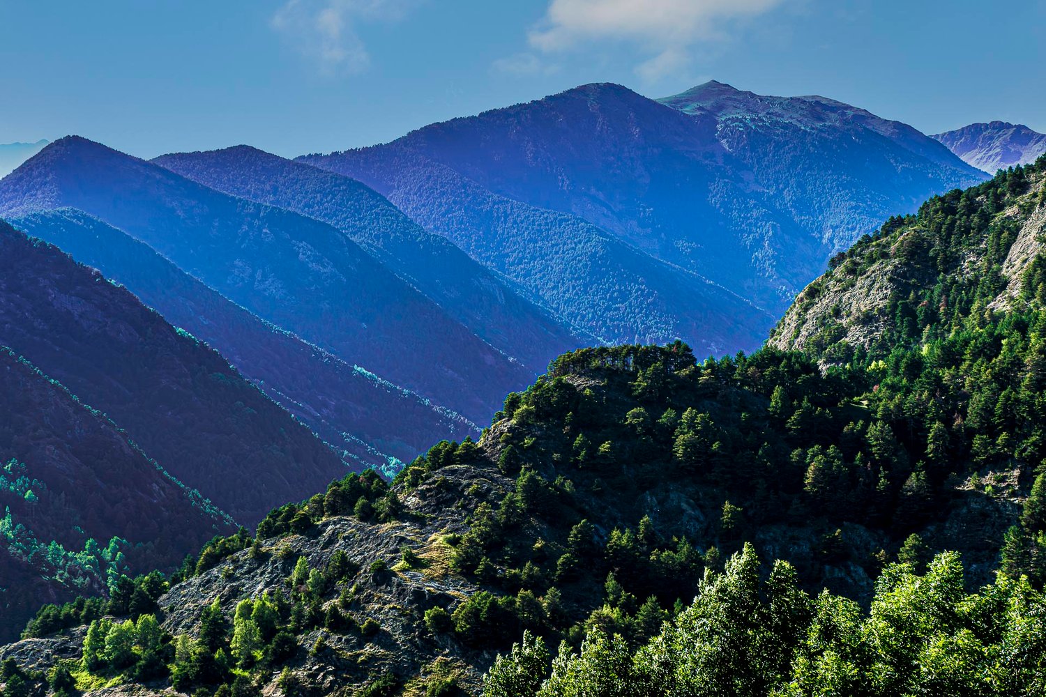 Layers of mountain ranges recede into the distance, each coated in dense forests and bathed in shades of blue and green. Light from the sky casts a gentle glow over the landscape, enhancing the natural beauty of the scene.