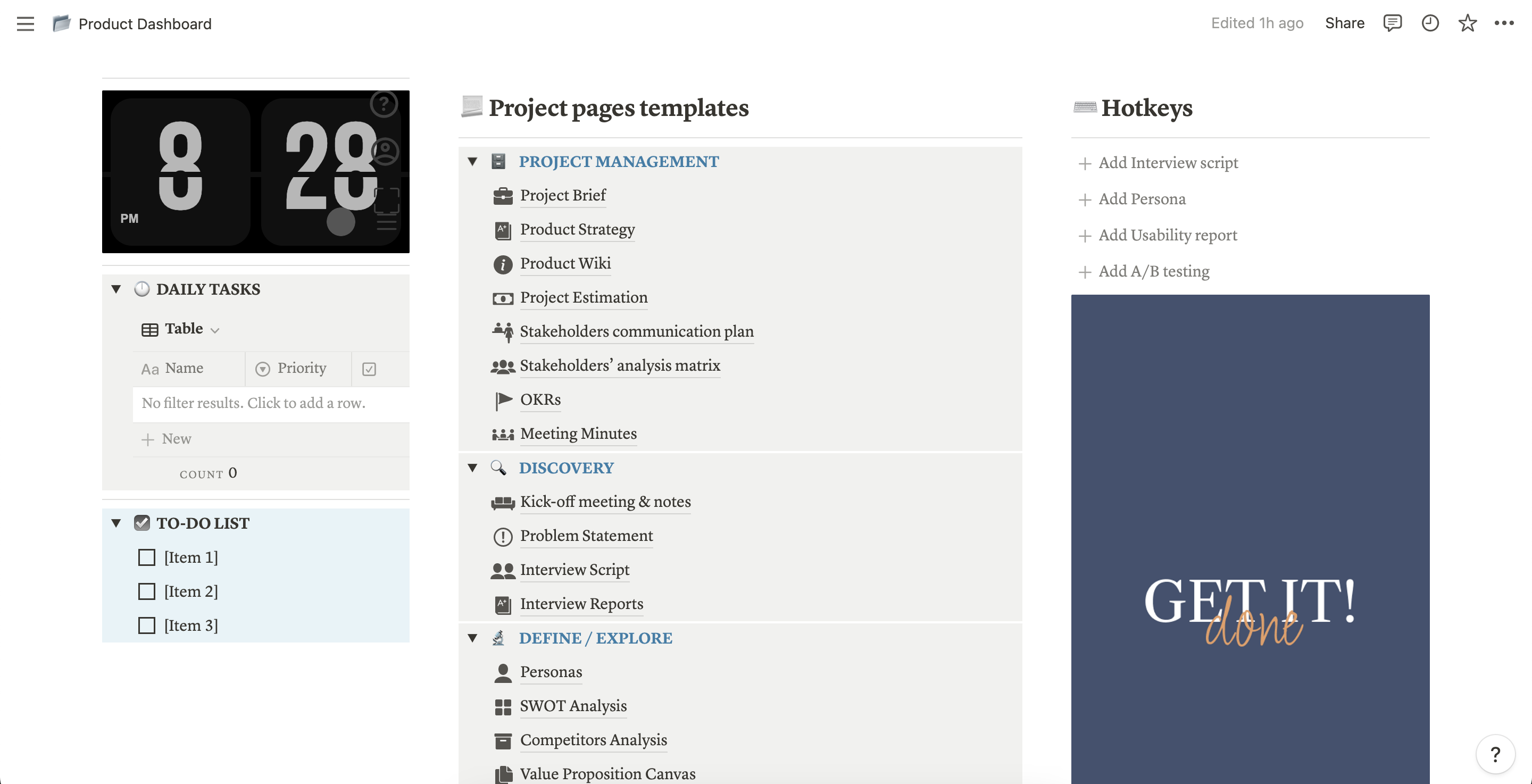 Tips and hints in every block. Just create a Notion account, make a copy of the template, and set up your project. All the artifacts and activities are in one place. Make your own repository and track all of the project details and tasks in one place.