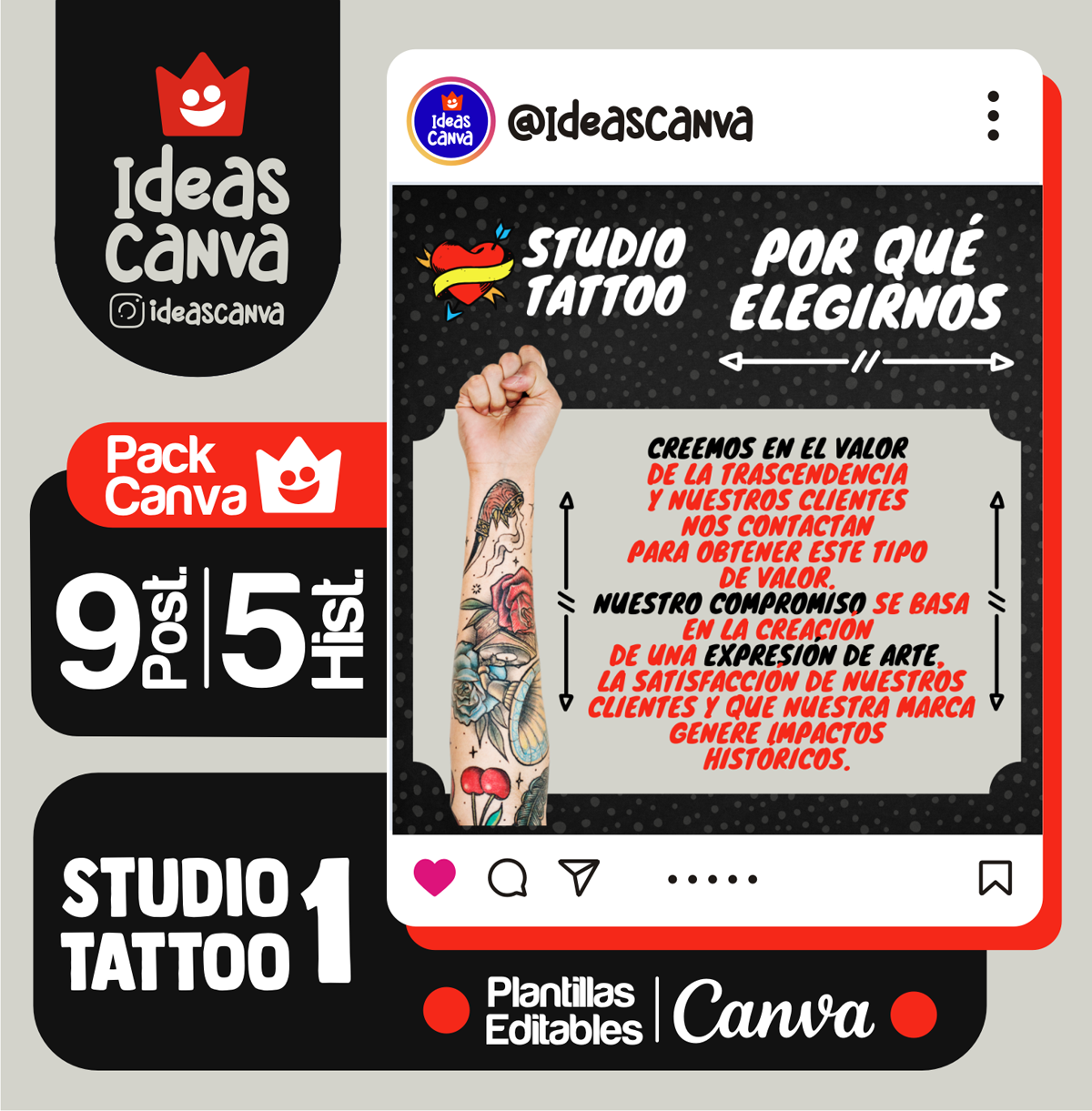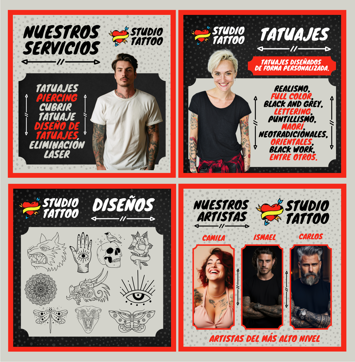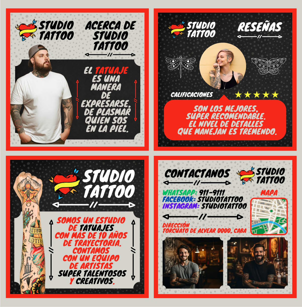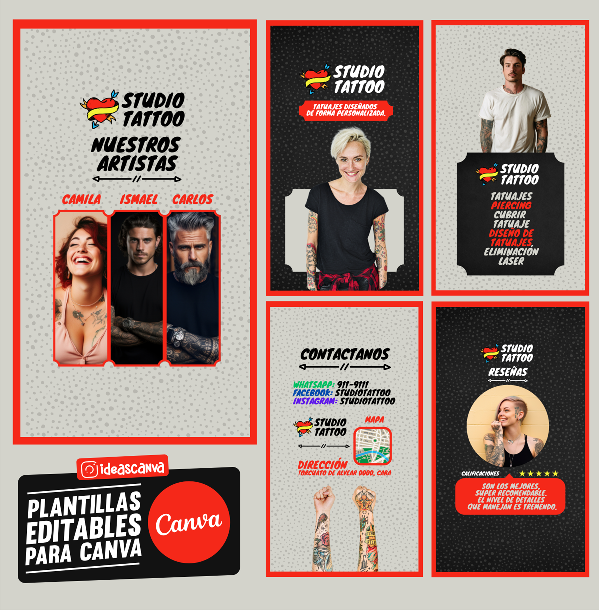 Plantilla Studio Tattoo 1, diseño ideal para Salud / Medicina. Edita textos, colores, imágenes y elementos fácilmente adaptando estos diseños a la temática de tu emprendimiento / negocio usando nuestras plantillas para Canva.