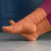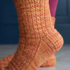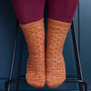 The Pedal to the Heddle socks use the same stitch pattern as my shawl pattern, Heddle. A heddle is part of a weaving loom. The stitch pattern used looks like a woven fabric, but it’s created using knit, purl and basic lace eyelets. The woven pattern is used together with a smattering of mock cables and basic ribbing for a deceptively simple stitch pattern.