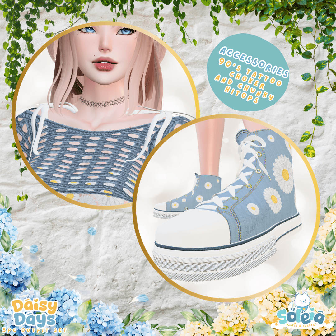 Jinxxy tags: rigged, ribbon, cute, comfy, cozy, spring, summer, floral, flower, bell, belle, bottoms, pants, jeans, denim, daisy, camellia, vine, embroidered, embroidery, tie, top, shirt, blouse, skater, baggy, chunky, hitop, hightop, sneakers, converse, trainers, knit, women, sweater, y2k