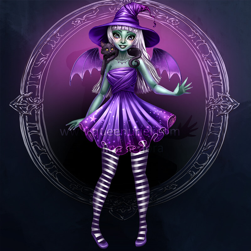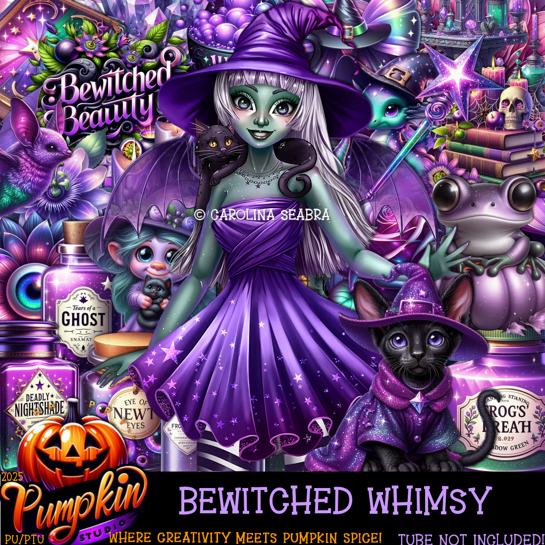 Step into a world of sparkle, shadow, and spellcraft with Bewitched Whimsy, a digital kit inspired by moonlit magic and playful witchy charm. This enchanting set features a whimsical witch with mint-green skin, silver hair, and a swirl of violet hues that shimmer like starlight. Her mischievous black cat familiar and bat-like wings add the perfect touch of Halloween mystery. Let your creativity take flight and cast a little digital magic into every creation you make.