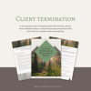- A detailed and easy-to-use template to document all aspects of the termination process, including client and therapist information, reasons for termination, and a comprehensive termination plan.