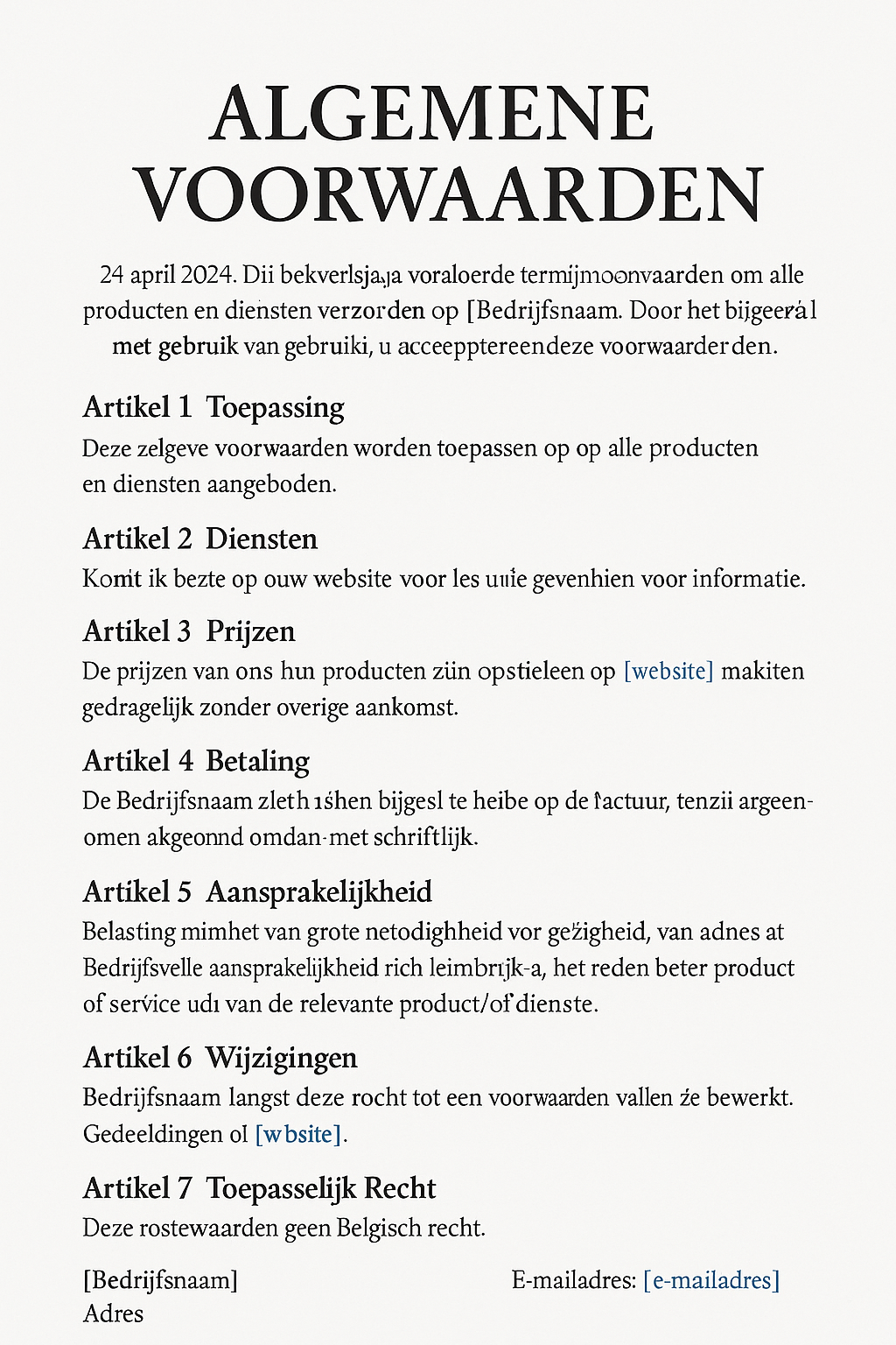 Wil je jezelf juridisch beschermen bij het aanbieden van producten of diensten? Deze algemene voorwaarden zijn hét fundament van jouw onderneming. Ze leggen vast wat jouw rechten en plichten zijn, en zorgen ervoor dat je duidelijk en professioneel overkomt bij je klanten.