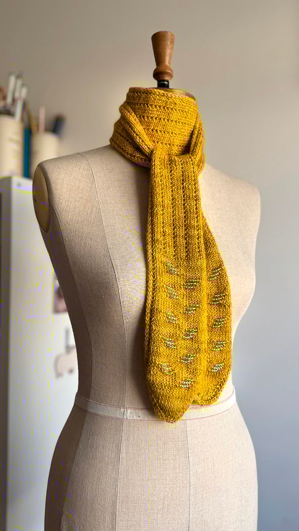 Named in honour of my grand niece who was born earlier this year, Rae is my glamorous take on the one hank DK weight scarf. It features pointed ends bejewelled with beaded floats, a main body worked in a subtle stripe texture and slip stitch edges at each side which give the scarf a wonderful, sleek finish.