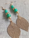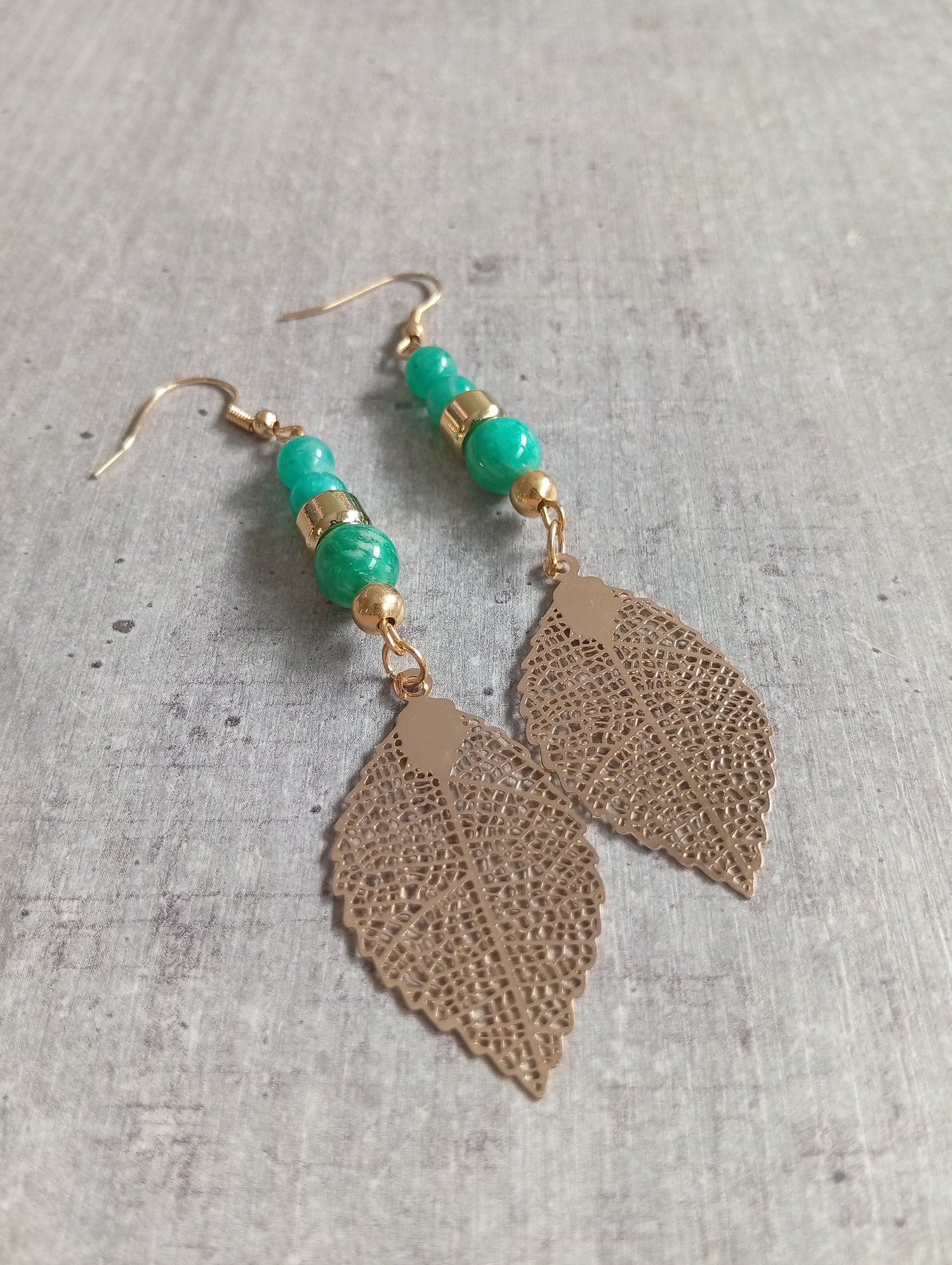 Boucles d’oreilles pendantes en amazonite, finition dorée, ornées de pendentifs feuille délicatement ajourés. Une création lumineuse qui allie énergie d’ancrage et fraîcheur, pour celles qui avancent avec douceur et détermination.