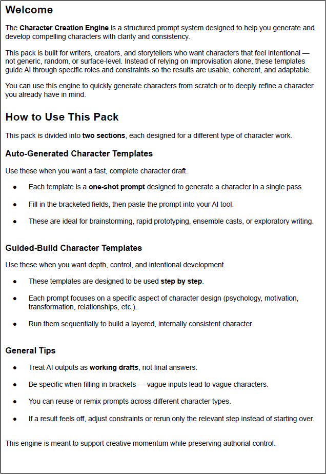 This pack is built for writers, creators, and storytellers who want characters that feel intentional — not generic, random, or surface-level. Instead of improvising everything from scratch, these templates guide an AI through specific roles and constraints so the results come back usable, coherent, and adaptable.