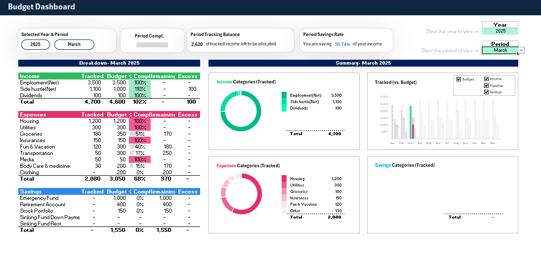 This interactive Excel file helps you track your income and expenses, giving you a clear overview of your finances and helping you reach your financial goals.