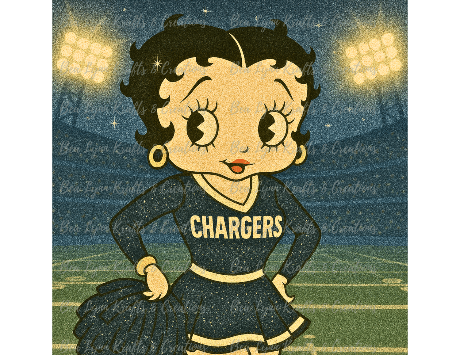 Light up your fan creations with this dazzling Betty Boop Chargers Cheerleader transparent PNG! Featuring the classic cartoon icon in a glittering navy cheer outfit with “CHARGERS” across the front, Betty poses with charm and spirit on a glowing stadium field. With sparkling detail, vintage style, and full cheer energy, this design is perfect for showing off your Chargers pride in a fun, retro way.