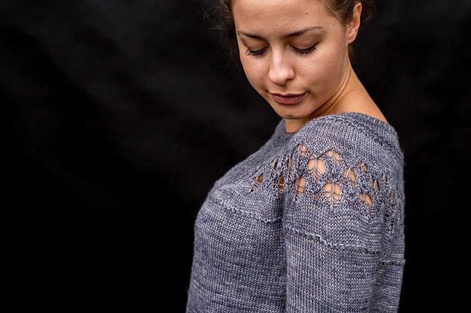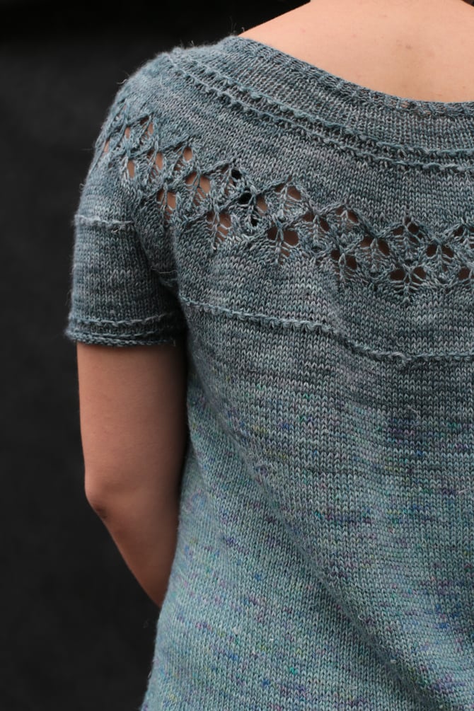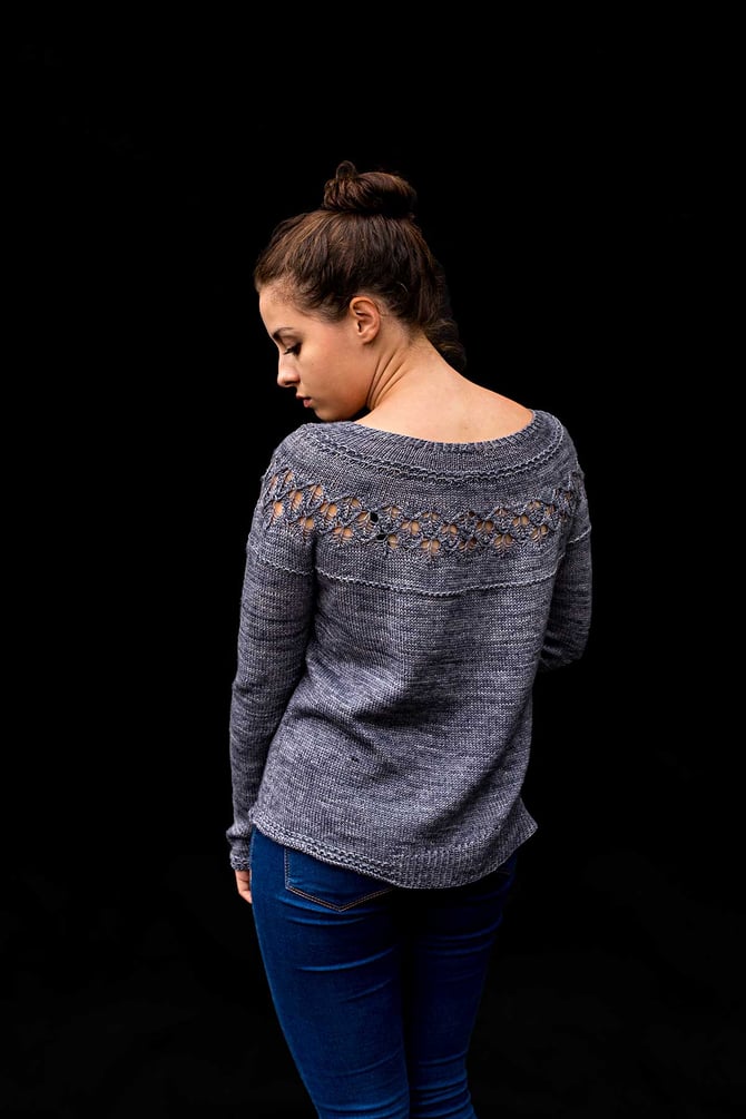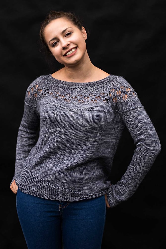 If you like circular yoke sweaters, but don’t care much about the good-girl look usually associated with garments constructed in this manner, try this one for a change: “Yokester” is a seamless sweater worked from the top down with a circular yoke, featuring a wide neckline, contemporary large-holed lace pattern on the yoke and asymmetrical ribbing at the hem – certainly not your run-of-the-mill pullover! It comes with two sleeve length options and optional fading instructions if using hand-dyed yarn.