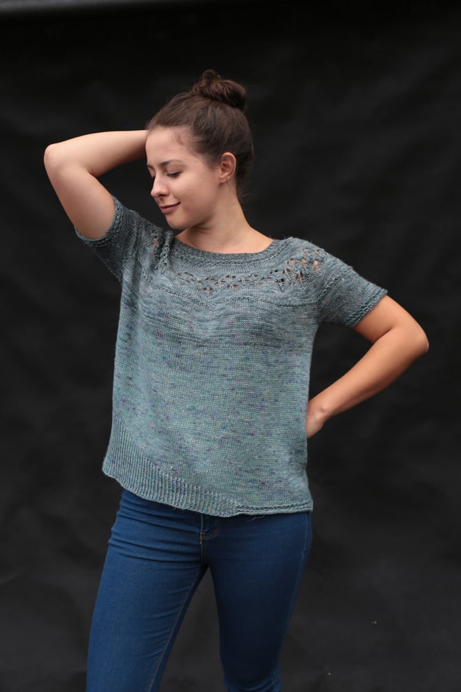 - Dye Dye Done Delicious (70% Alpaca, 20% Silk, 10% Cashmere): 100g/ 437 yards [400 meters] Short sleeved version: 2 (2, 2, 2, 3, 3, 3, 3, 3) skeins or approx. 700 (750, 800, 860, 930, 1000, 1070, 1140, 1210) yards [640 (690, 730, [790, 850, 920], 980, 1050, 1100) meters]. Long sleeved version: 3 (3, 3, 3, 4, 4, 4, 4, 5) skeins or approx. 1080 (1150, 1220, [1300, 1390, 1500], 1600, 1710, 1820) yards\ 990 (1050, 1115, [1190, 1270, 1370], 1460, 1560, 1660) meters]. Samples are size S1 worn with 5.5” [14 cm] of positive ease knit in colorways “Forest at Dusk” and “Starling” (short sleeved version) and “Moria” (long sleeved version).