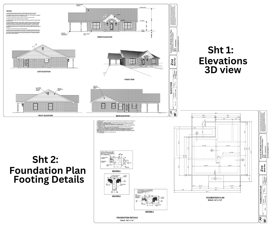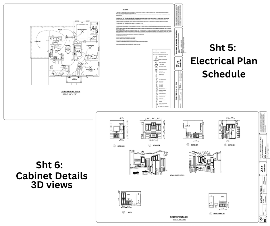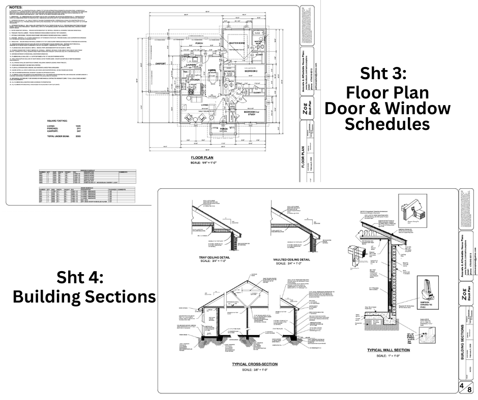 Your full construction blueprint set includes everything needed for permitting and building (PDF format, 24”x36”):