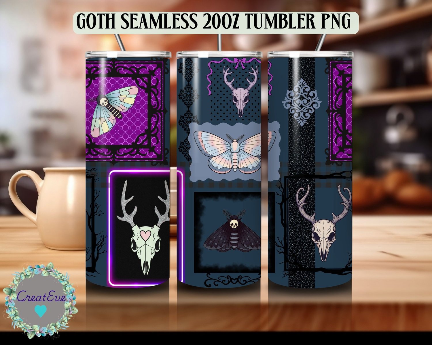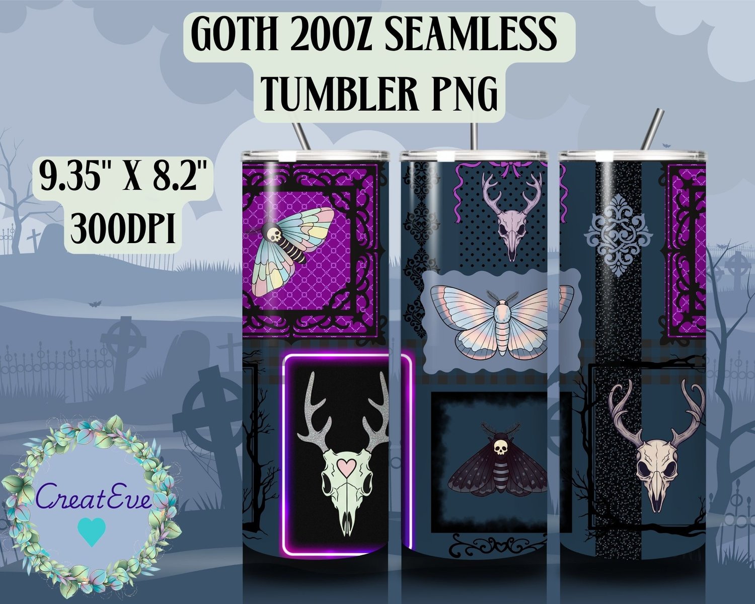 Goth Antler Skull & Moth 20oz Seamless Tumbler PNG, 300dpi, 9.35" x 8.2"