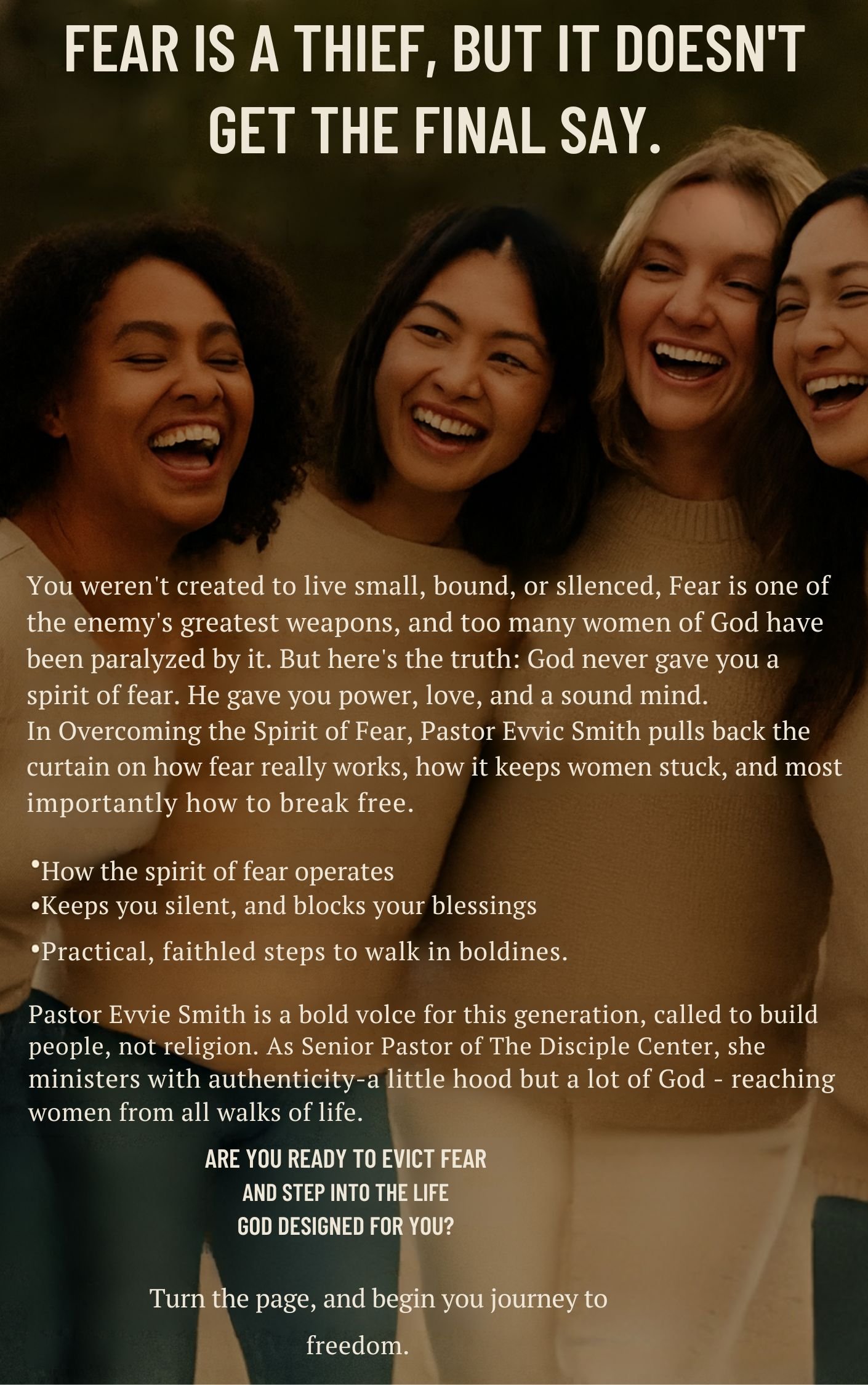 In Overcoming the Spirit of Fear, Pastor Evvie Smith takes you on a raw, transparent, and empowering journey of faith. Drawing from scripture, personal testimony, and real-life battles, she exposes how fear operates, how it paralyzes God’s people, and how you can break free once and for all.