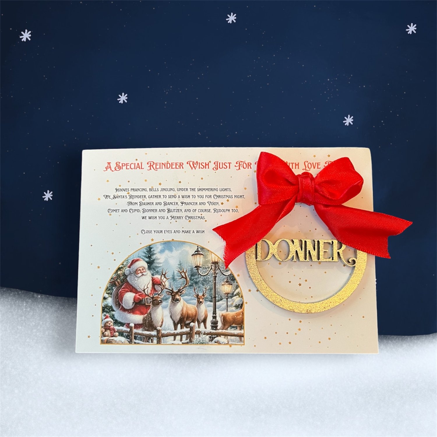 A special reindeer wish gift from your favourite reindeer. 9 Variations. Dasher, Dancer, Prancer, Vixen, Comet, Cupid, Donner, Blitzen and Rudolph. If the reindeer you want is out of stock please message direct. A6 in size with wooden decoration attached.