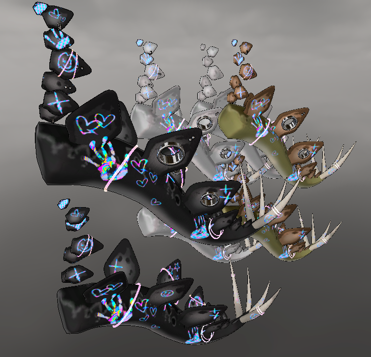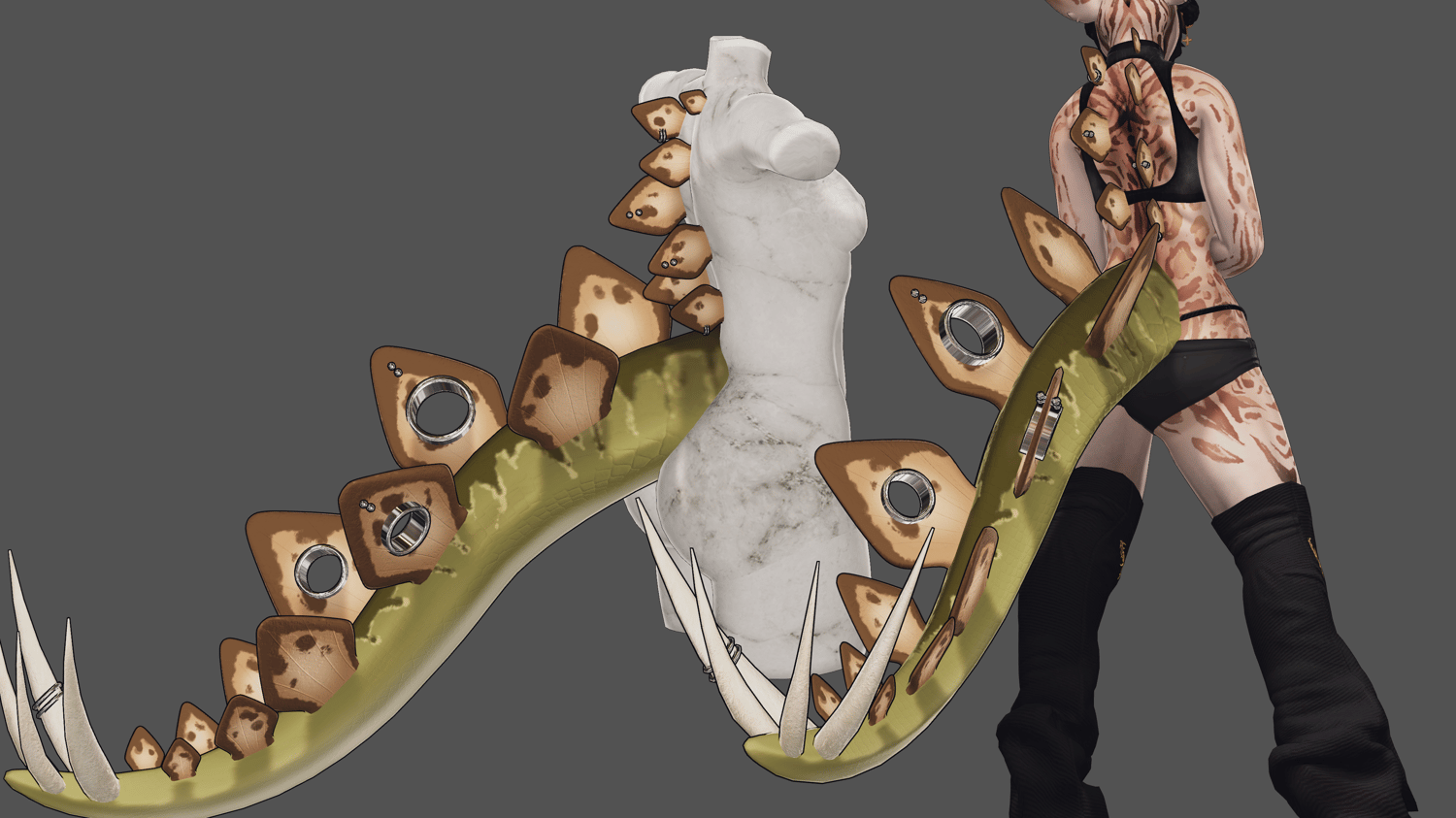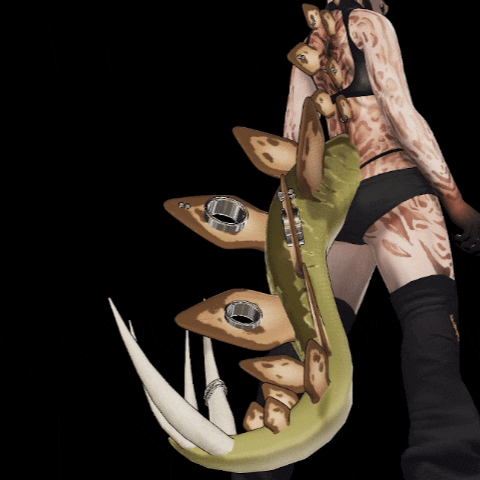 A detailed and pointy Stegosaurus set, fit to the egirl base! This will probably be the last of my dinosaur series for a while, but I will continue to make content for the existing assets; my next plans are things like party packs, with emissions and glow sticks, and cute packs with bows n lace. I loved working on these!