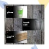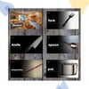 fork, knife, spoon, chopsticks, pot, pan, wok, faucet, sink, fridge, microwave, oven, stove, plate, bowl, cup, mug, glass, chopping board, and trash can.