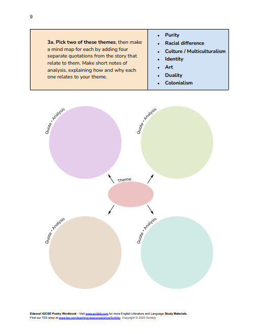 121 pages in total, this workbook is organised systematically, poem by poem. Each poem worksheet contains a set of varied tasks, exercises and practice essay questions, as well as a mind map to help students explore quotations and themes. See the preview images for more info on the types of tasks that are available!