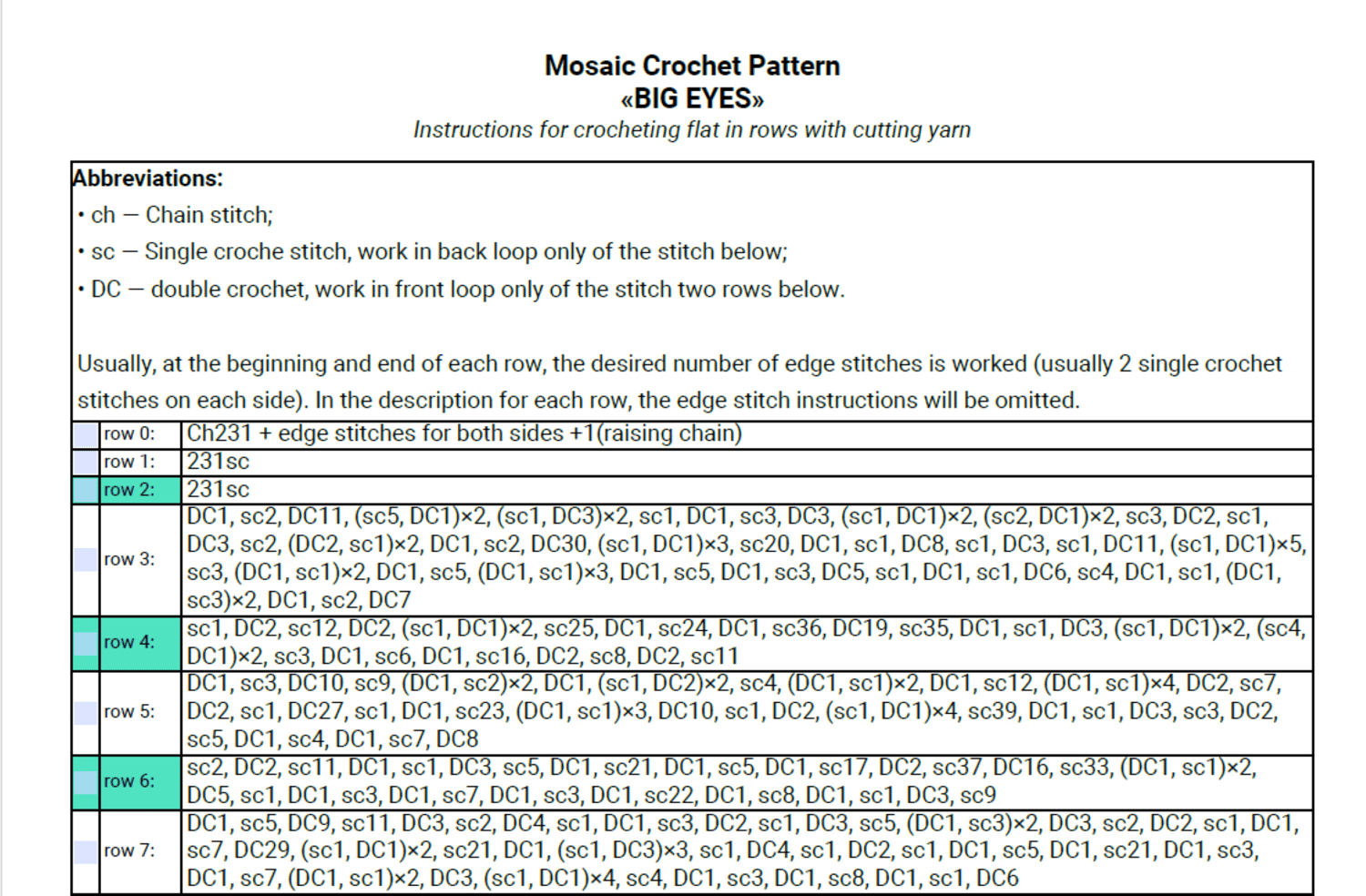 Overlay Mosaic Crochet, BIG EYES, wrtitten pattern row by row, Big Chart with Xs, in PDF