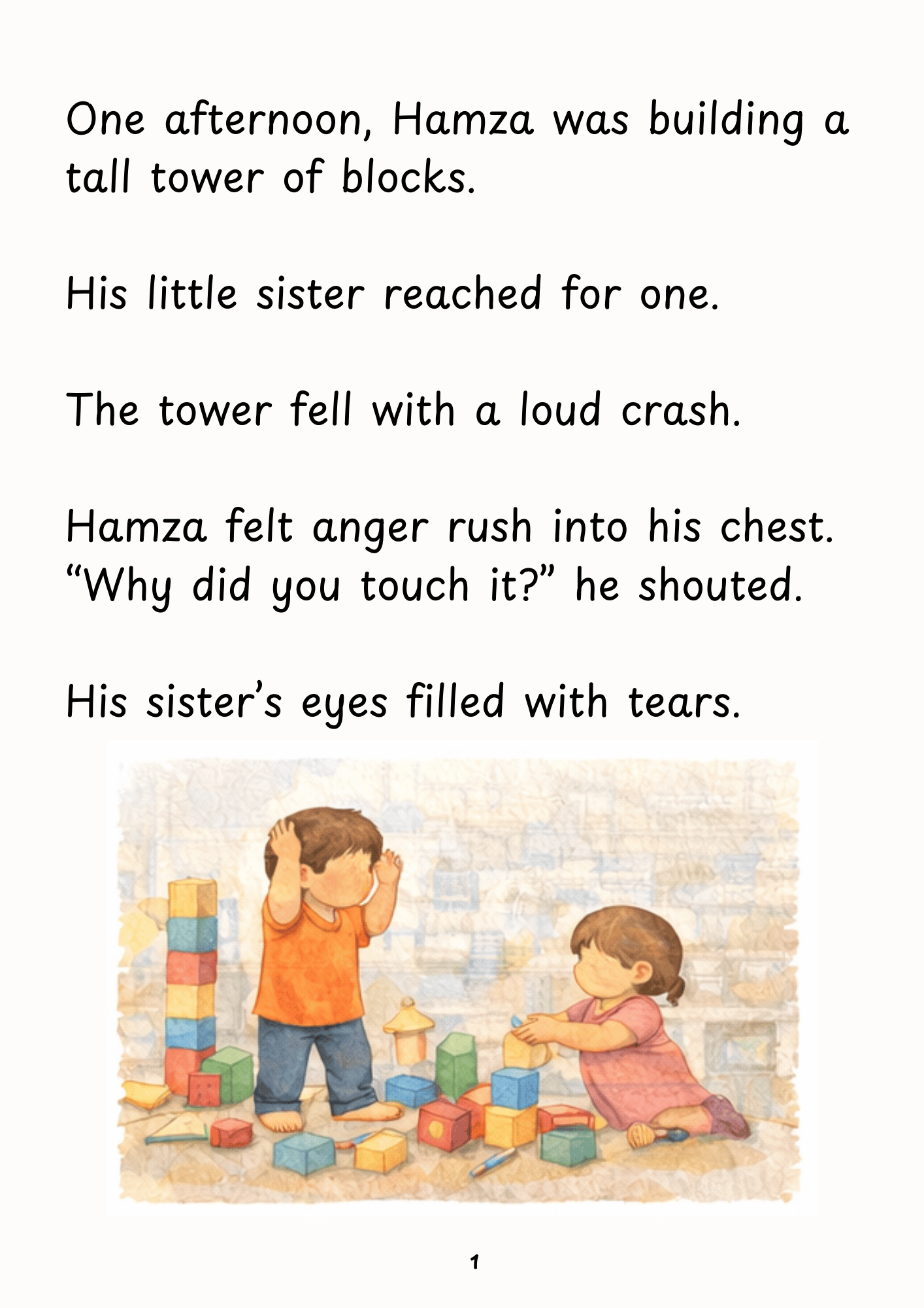 This heartfelt story follows Hamza as he struggles with anger after his tower of blocks falls. He shouts. His sister cries. Later, he feels something heavier than anger. Regret. Through simple guidance and a reminder from the Sunnah, he learns that real strength is not about being loud. It is about admitting when you are wrong.