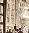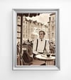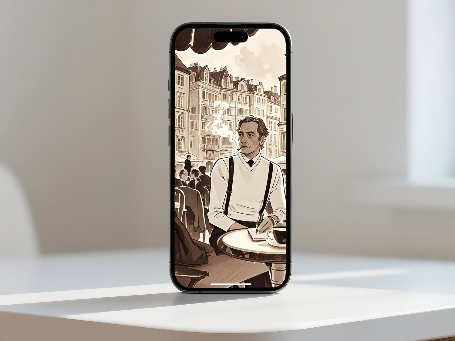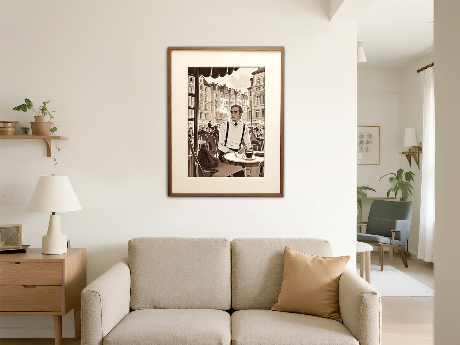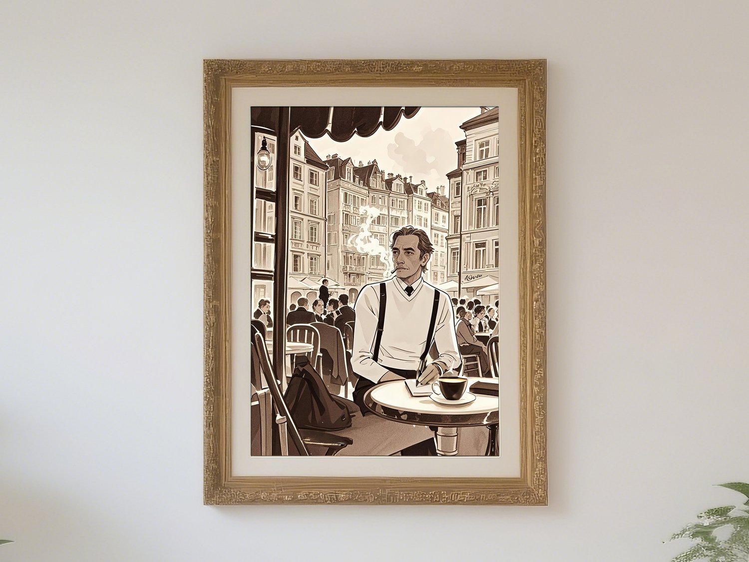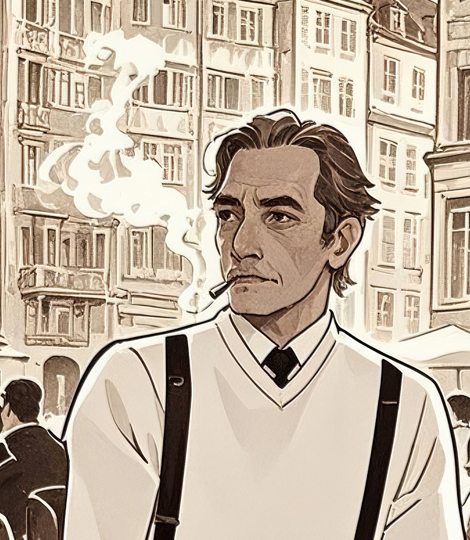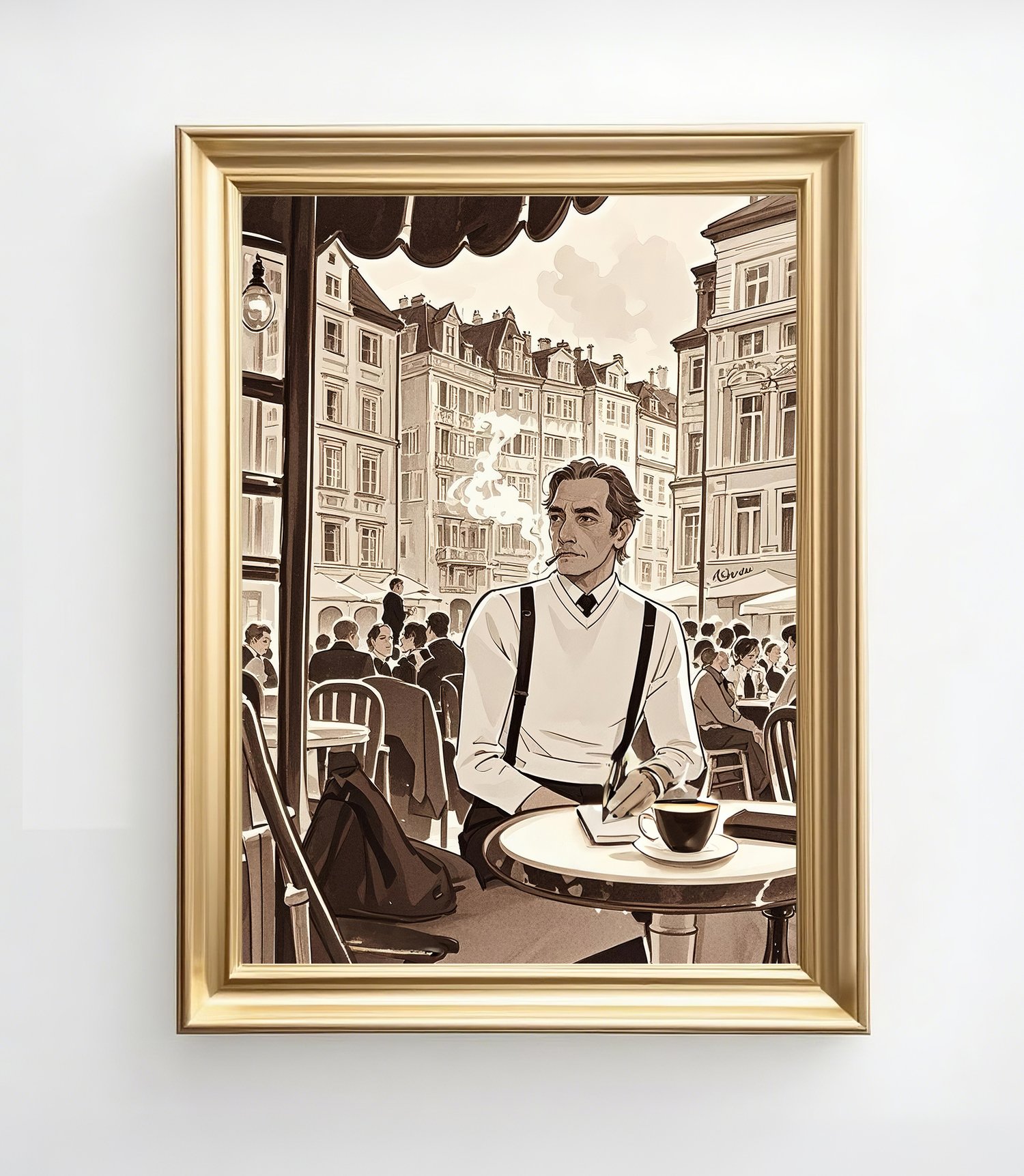 The sepia-toned palette evokes a sense of timelessness, as though the viewer is peering into a scene from a bygone era. The central figure, dressed in a classic outfit with suspenders, cigarette in hand, and pen poised over a notebook, radiates the aura of a writer or thinker—an intellectual lost in contemplation. The surrounding architecture and bustling crowd are rendered with rich yet softened detail, ensuring the focus remains on the solitary figure.