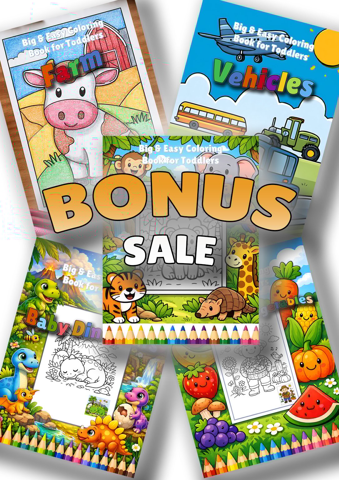 This 5-Book Mega Bundle includes five adorable Big & Easy coloring books specially designed for toddlers ages 2–4. Every page features extra large illustrations, very thick bold outlines, and minimal details — perfect for beginners just starting their coloring journey.